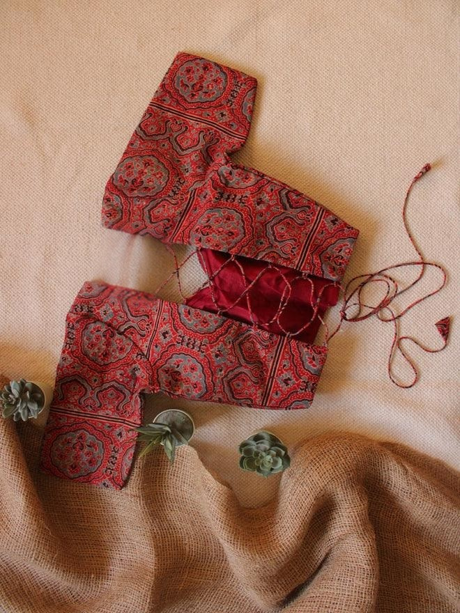 Add the Ajrakh Cotton Backless Knot Blouse to your wardrobe and make a striking statement rooted in tradition and style.