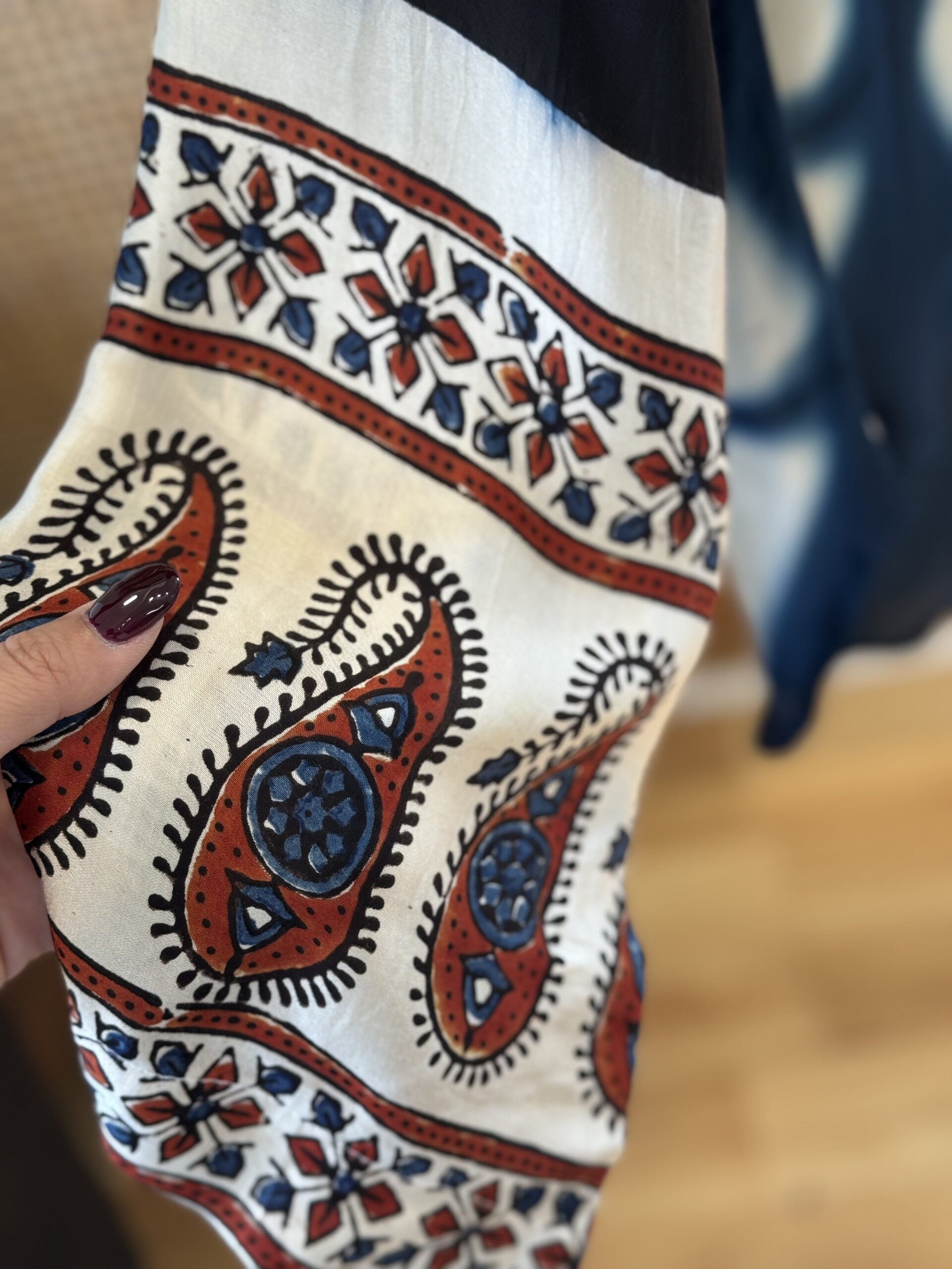 - Unique Craftsmanship: Combines traditional Ajrakh block printing with Japanese Clamp Shibori technique.