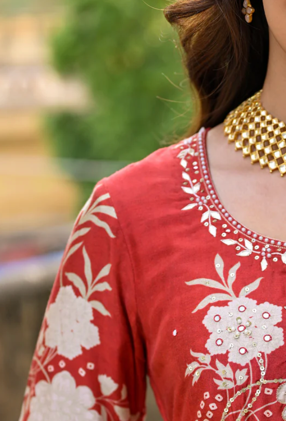 The Bandhani Muslin Suit in Red with Gota Patti is a timeless celebration of heritage and elegance. Crafted in soft muslin fabric, this radiant red ensemble showcases classic Bandhani patterns enriched with delicate gota patti work. Perfectly paired with pants, it is an ideal outfit for weddings, festive gatherings, and cultural celebrations.