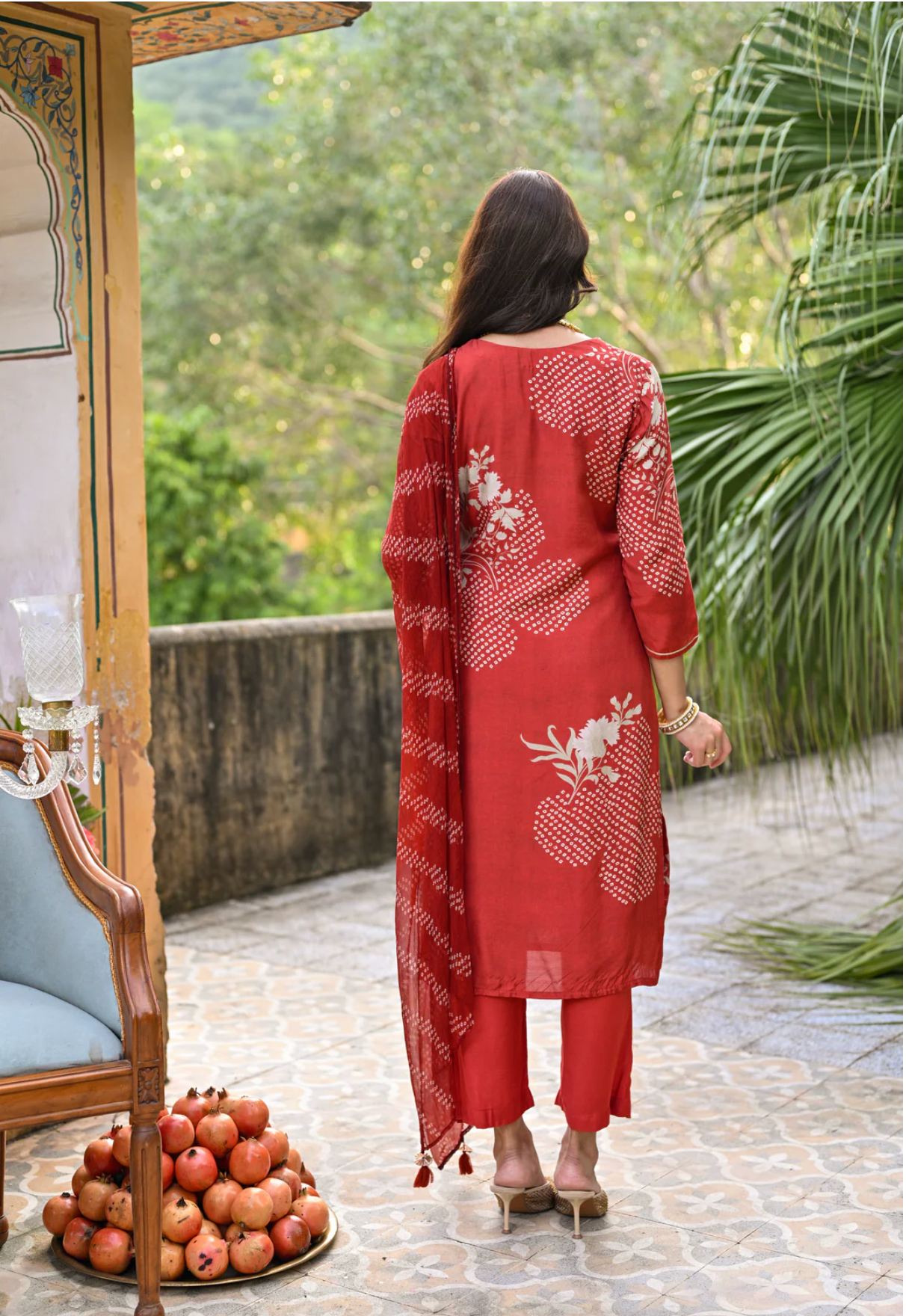 Step into celebrations with the Bandhani Muslin Suit in Red with Gota Patti  a radiant blend of tradition, culture, and festive elegance.