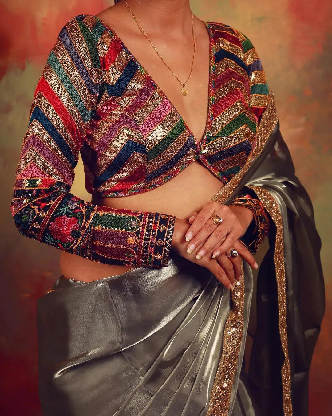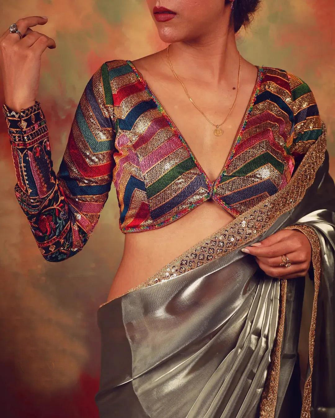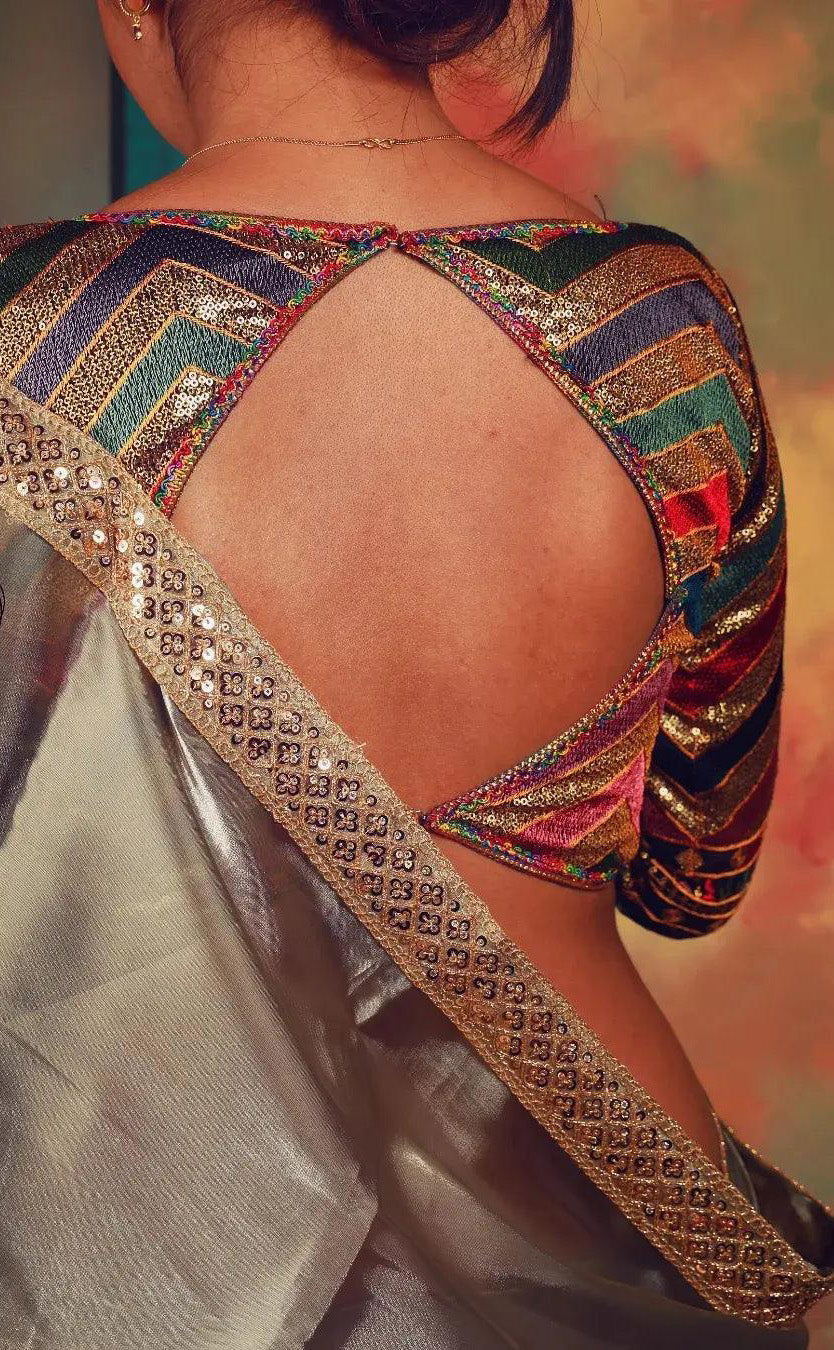 Pair this blouse with a silk saree, tissue saree, or georgette drape. It also looks great with lehengas or skirts. The detailed sequin work sparkles softly, making it perfect for evening events.