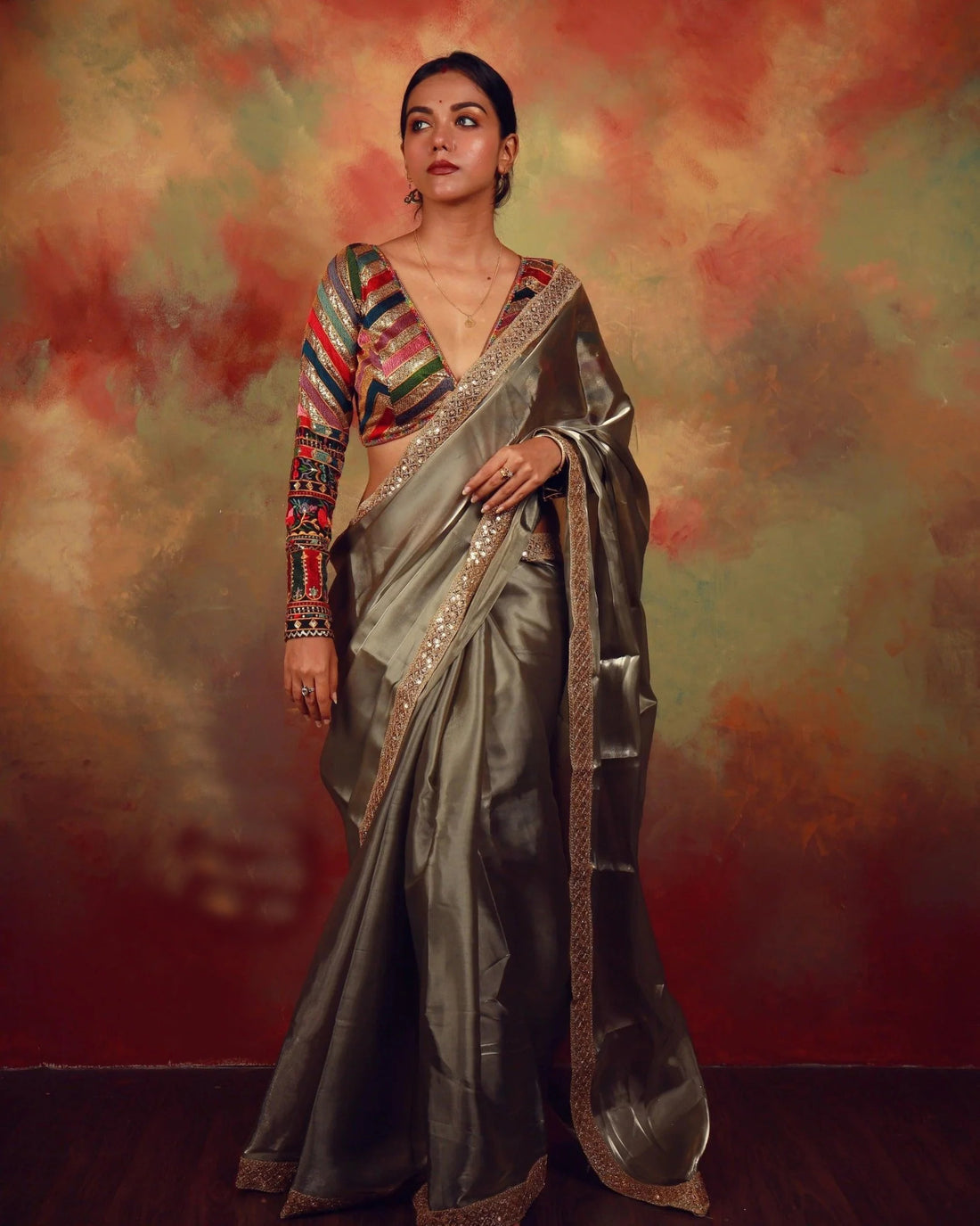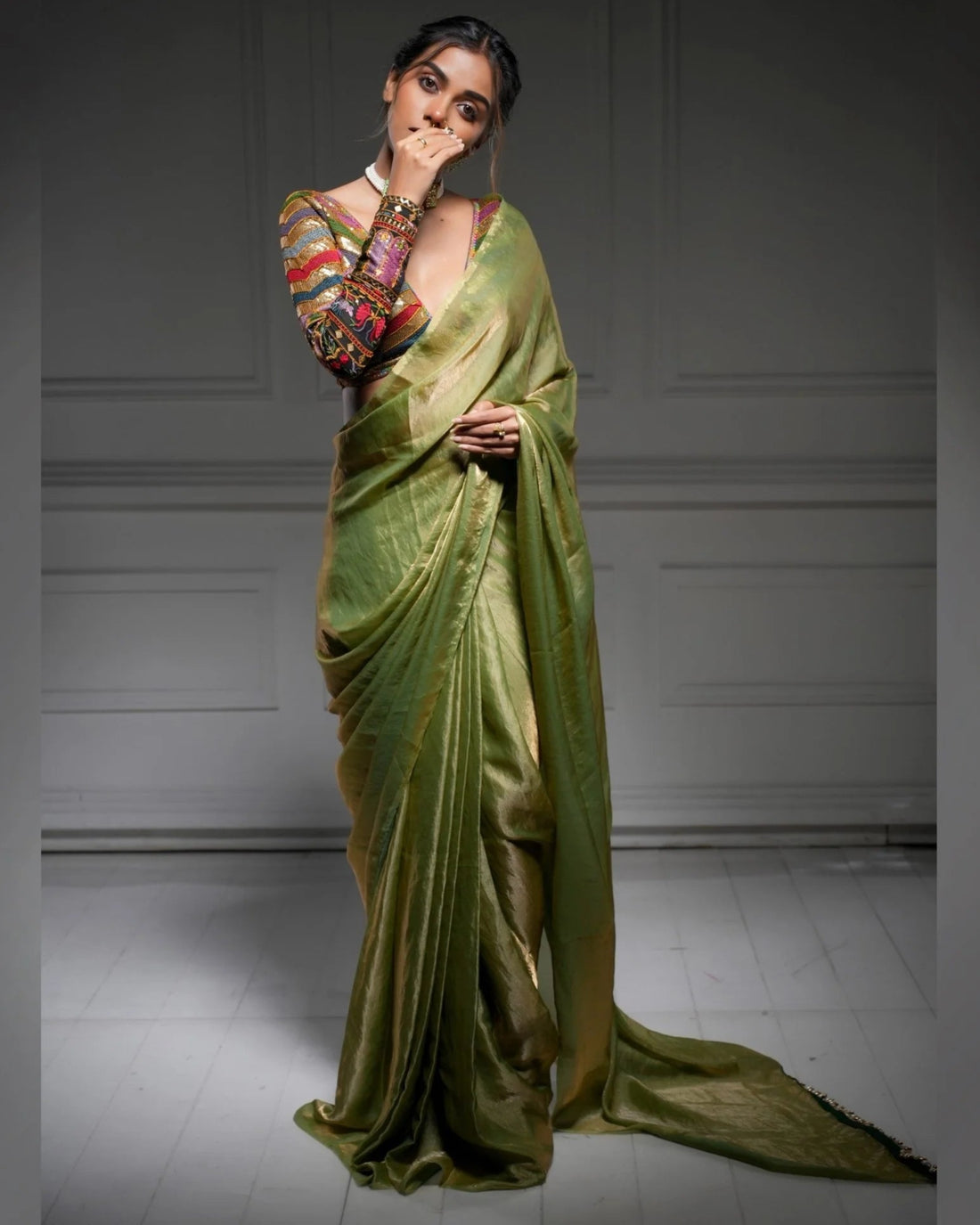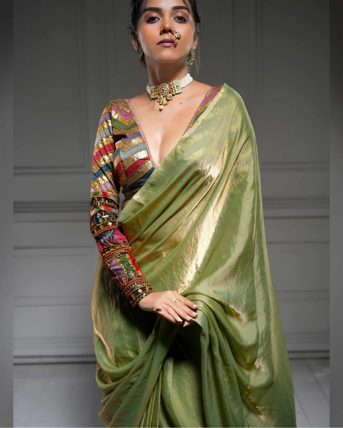 Pair this blouse with a silk saree, tissue saree, or georgette drape. It also looks great with lehengas or skirts. The detailed sequin work sparkles softly, making it perfect for evening events.