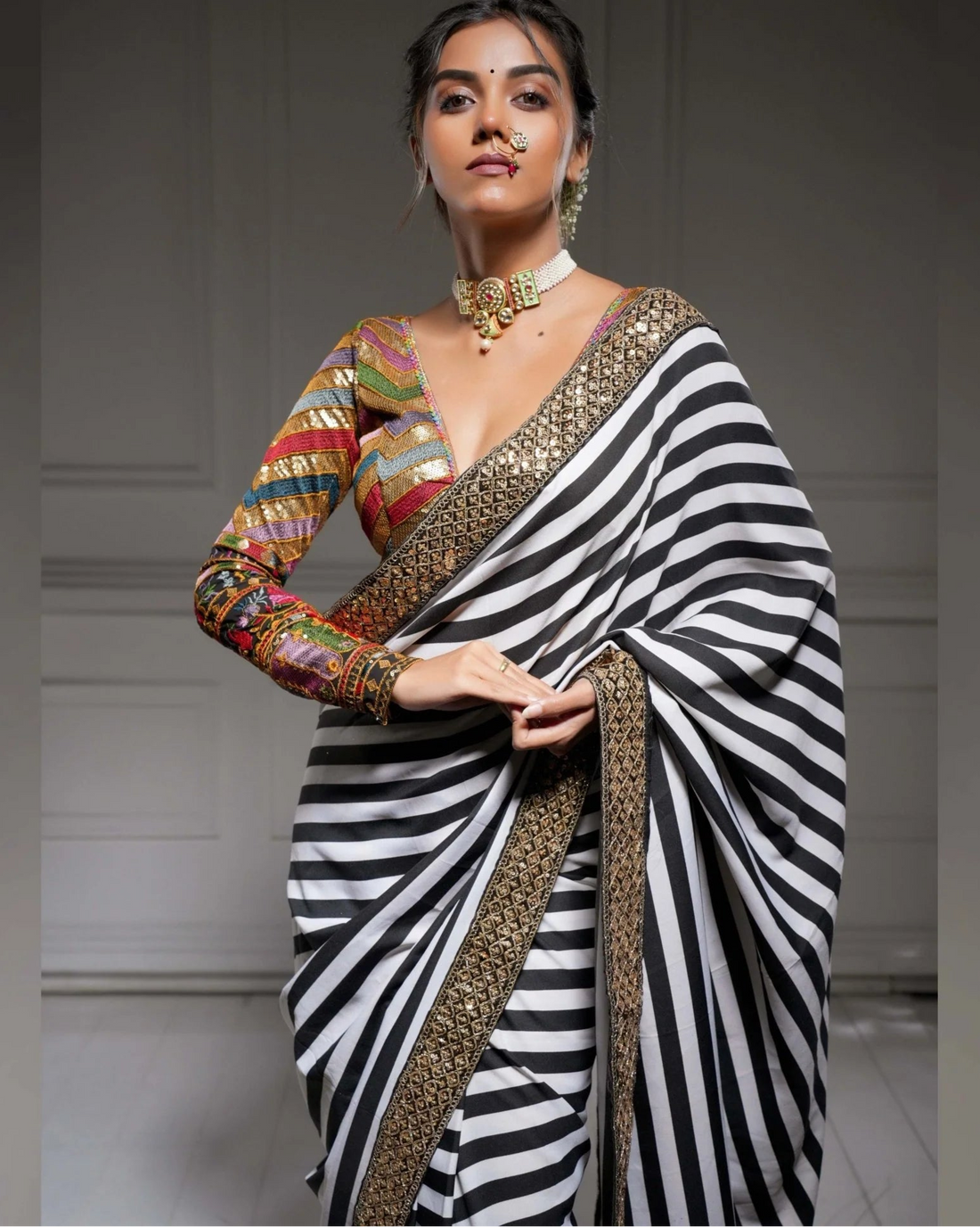 The Bebaak Neela Georgette Black Blouse is designed for special moments. Its soft georgette fabric feels light on the skin. The black hue is highlighted with a zigzag pattern in multi-colour sequins and fine thread work. This blouse is perfect for celebrations, weddings, or festive occasions.