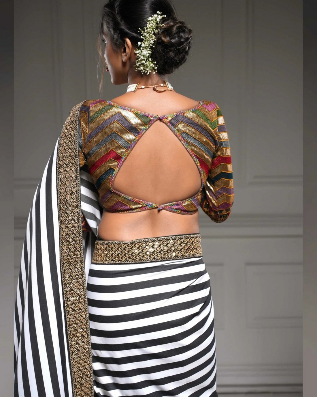 The blouse comes with full sleeves. The sleeves drape beautifully and match the overall design. The back features a diamond-shaped cut, giving a chic and graceful look.