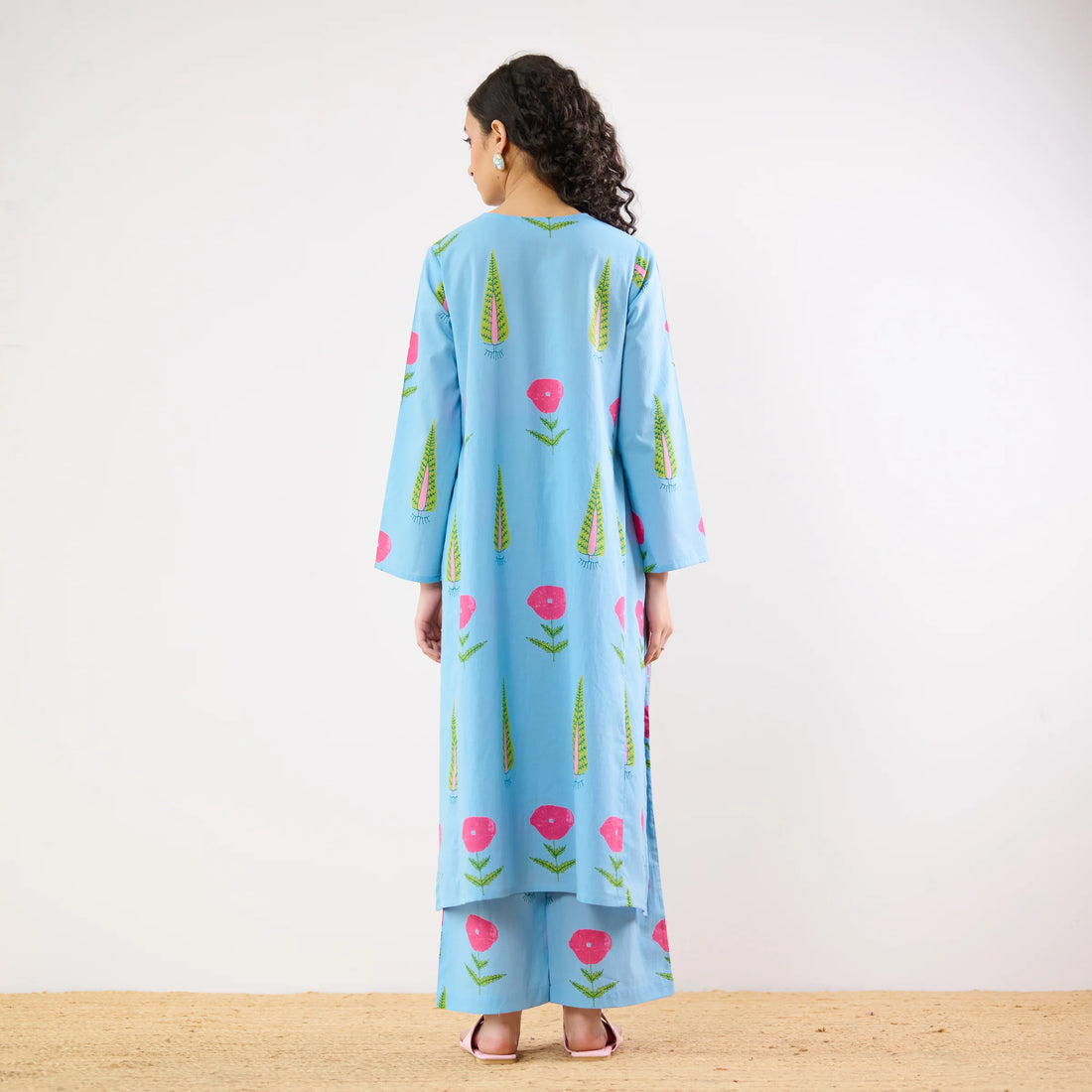Crafted from soft, breathable fabric, the set ensures all-day ease without compromising on style. The intricate Bagh print draws inspiration from traditional artistry, adding cultural richness and refined charm. A relaxed silhouette paired with a stylish high-slit detail introduces a modern edge, creating a flattering and polished look perfect for multiple occasions.
