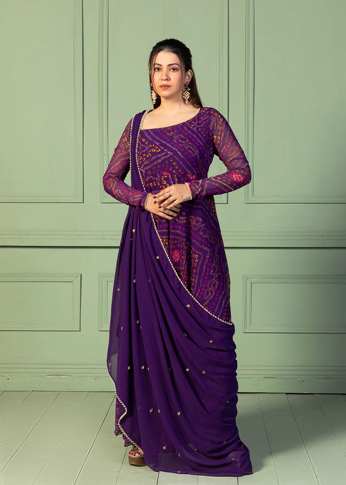 Make every occasion memorable with the Blue Bandhani Asymmetric Neck Anarkali with Dupatta a radiant ensemble that fuses tradition, elegance, and contemporary style.