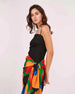 Paired with a colorful, abstract print sarong, this beach dress is perfect for relaxing by the water or enjoying a beachside dinner. The sarong features vibrant hues, creating a beautiful contrast against the black mini dress. With its flowing silhouette and side tie-up detailing, the sarong can be adjusted to fit your comfort and style. Whether you're strolling along the beach or attending a beach party, this co-ord set keeps you stylish and confident.