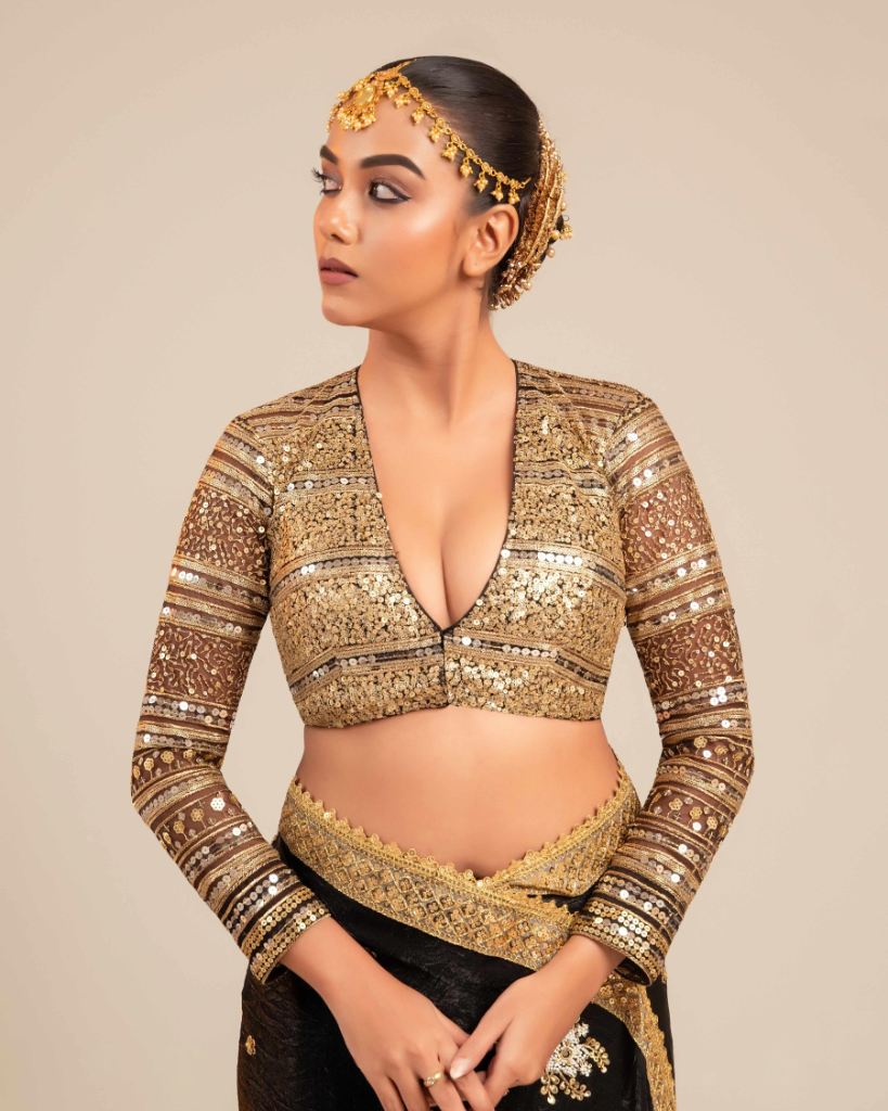 Add this Black Butter Metallic Saree with Retro Radiance Blouse to your wardrobe for contemporary glamour, luxurious detailing, and sophisticated festive elegance.