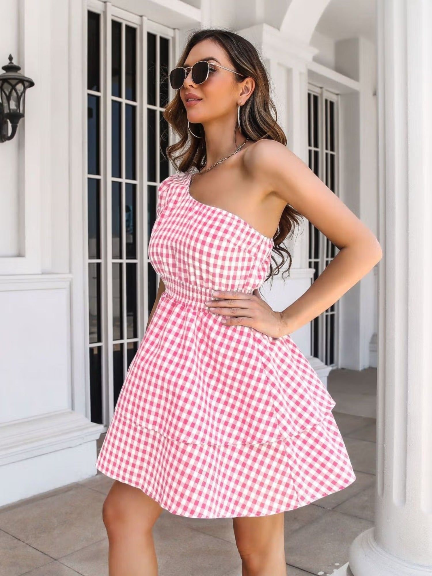 Add this Blue Checked One-Shoulder Short Dress to your collection for a stylish, easygoing, and effortlessly chic vacation look.
