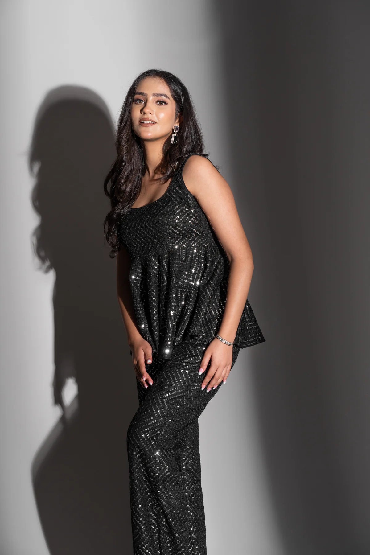 Add this Black Evening Glow Co-Ord Set to your wardrobe for a sparkling, elegant, and effortlessly sophisticated evening look.