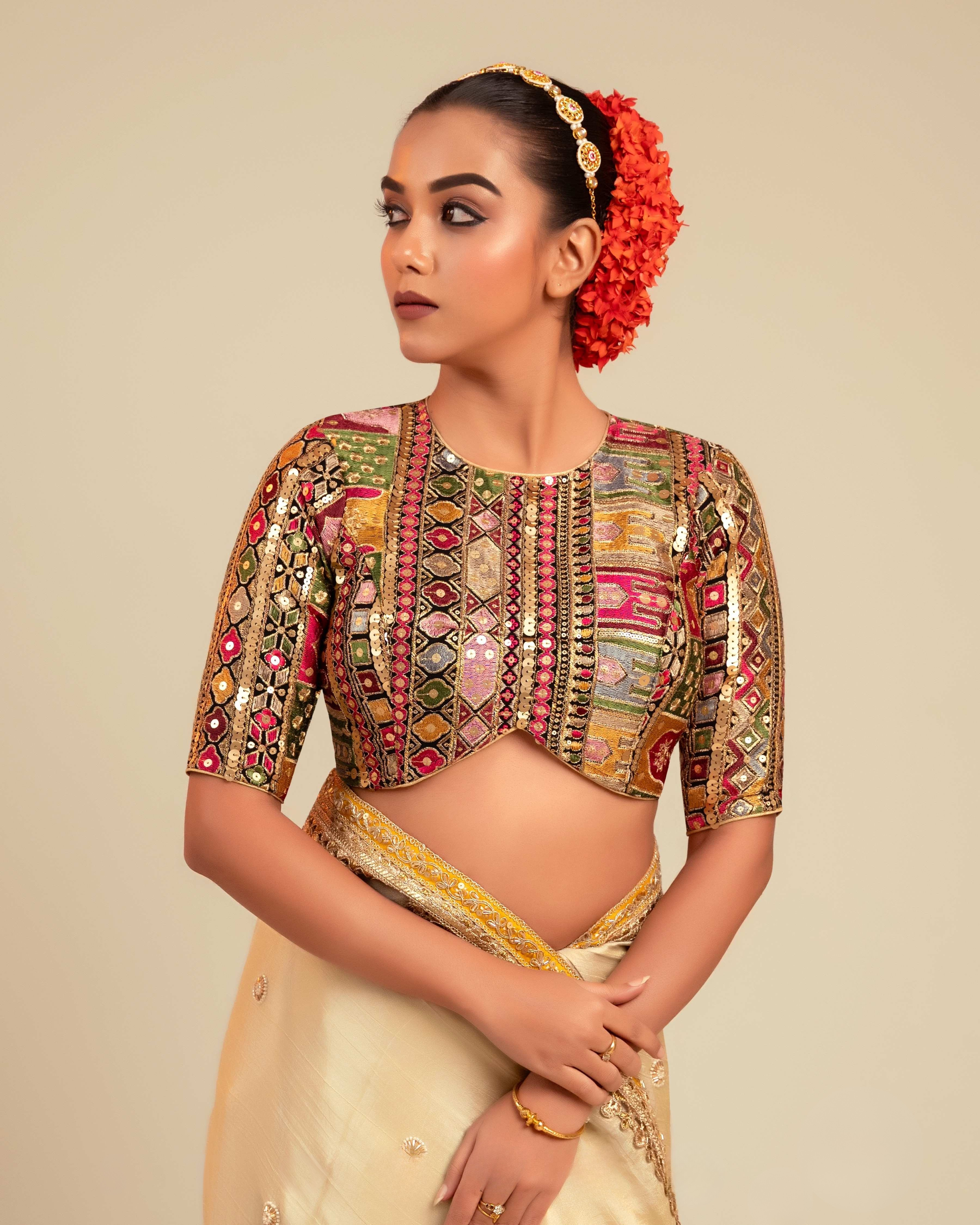 The Gul Kaari Siah Edge Blouse is crafted to bring vibrance and charm to any saree look. Made from premium georgette fabric, it features exquisite multicolor thread embroidery combined with delicate sequins work along the edges, adding a festive sparkle. Lightweight and graceful, this blouse blends traditional artistry with contemporary elegance, making it an ideal choice for weddings, festive gatherings, and cultural events.