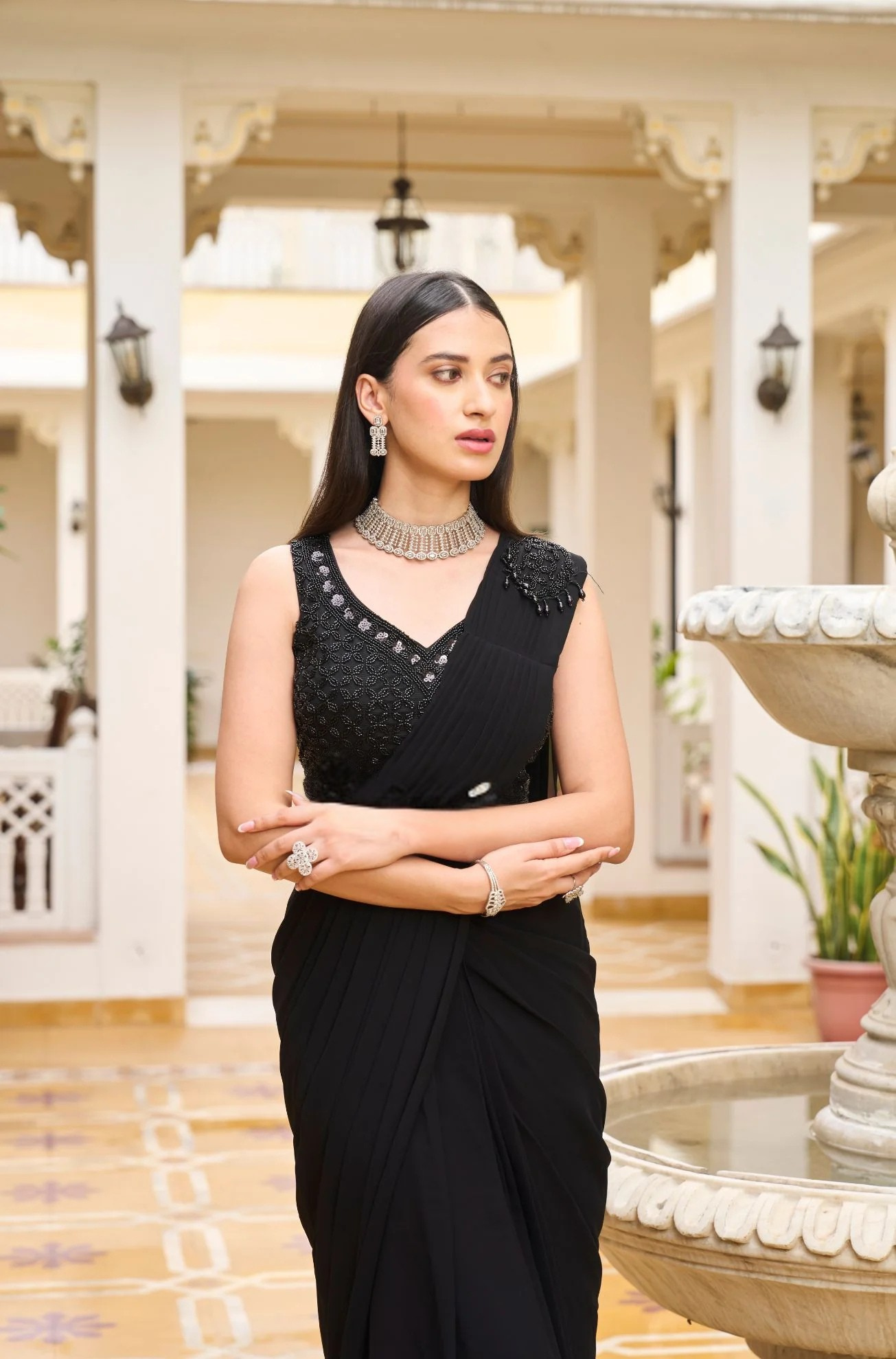 Make a striking statement with this Black Net Pre-Draped Saree adorned with delicate moti work that adds subtle shine and refined elegance. Crafted on a soft net fabric with a viscose base, it offers a lightweight feel and an effortless drape that flatters every silhouette. The pre-stitched structure ensures easy wear, allowing you to achieve a graceful saree look in minutes.