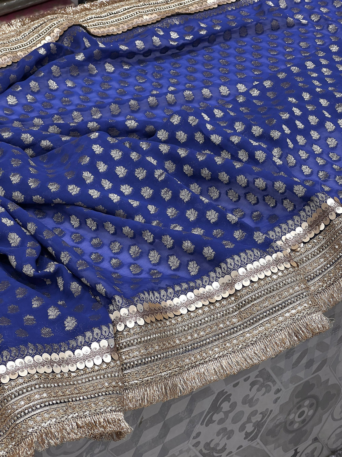Add this Blue Banarasi Georgette Lace Saree to your wardrobe for a regal, elegant, and timeless ethnic ensemble.