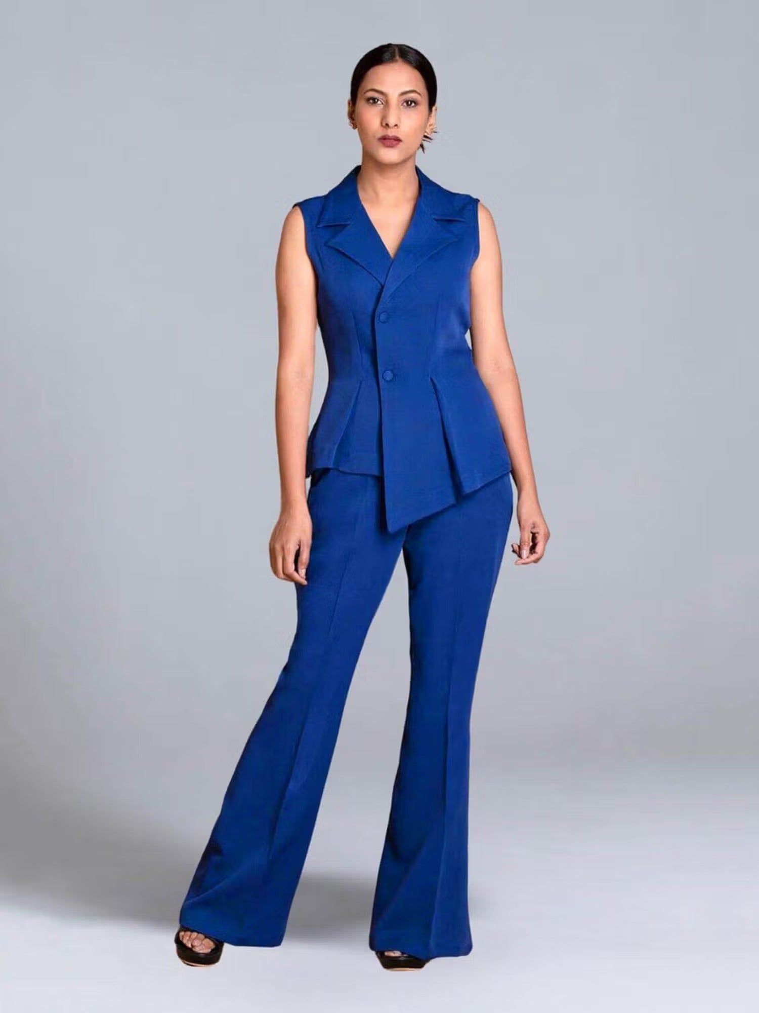 Add this Blue Crepe Asymmetrical Fitted Co-Ord Set to your wardrobe for a sleek workwear upgrade that blends confidence, comfort, and modern style.