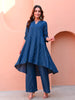 The Blue Georgette Lurex Kurta features an A-line silhouette that is flattering on all body types. The high-low hemline adds a modern twist to the traditional kurta, giving it a more contemporary feel. The round notch neckline provides a subtle yet chic frame for your face, perfect for pairing with delicate jewelry or accessories.