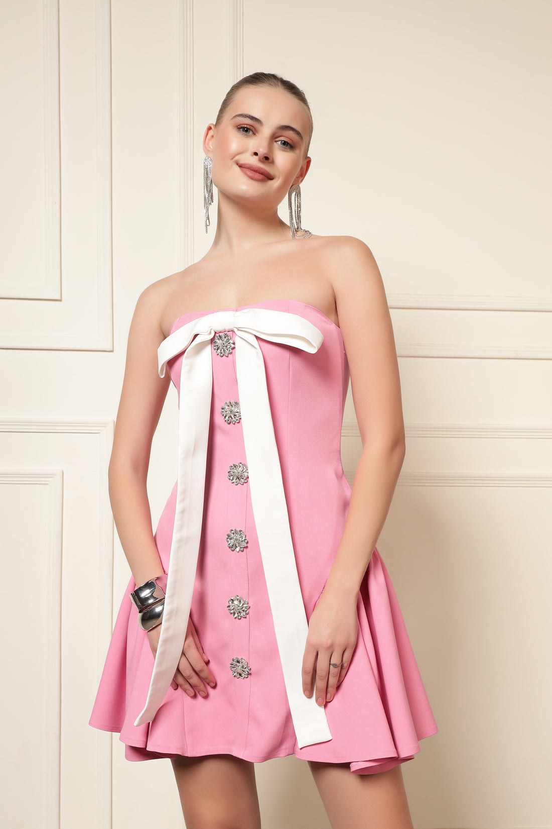 The Blush Pink Strapless Mini Dress is designed to bring playful elegance and modern charm to your wardrobe. Crafted from soft structured fabric, this dress features a fitted strapless bodice paired with a flared skirt that creates a flattering and feminine silhouette. Its mini length and graceful design make it perfect for parties, brunches, date nights, and special occasions, offering comfort with stylish appeal.