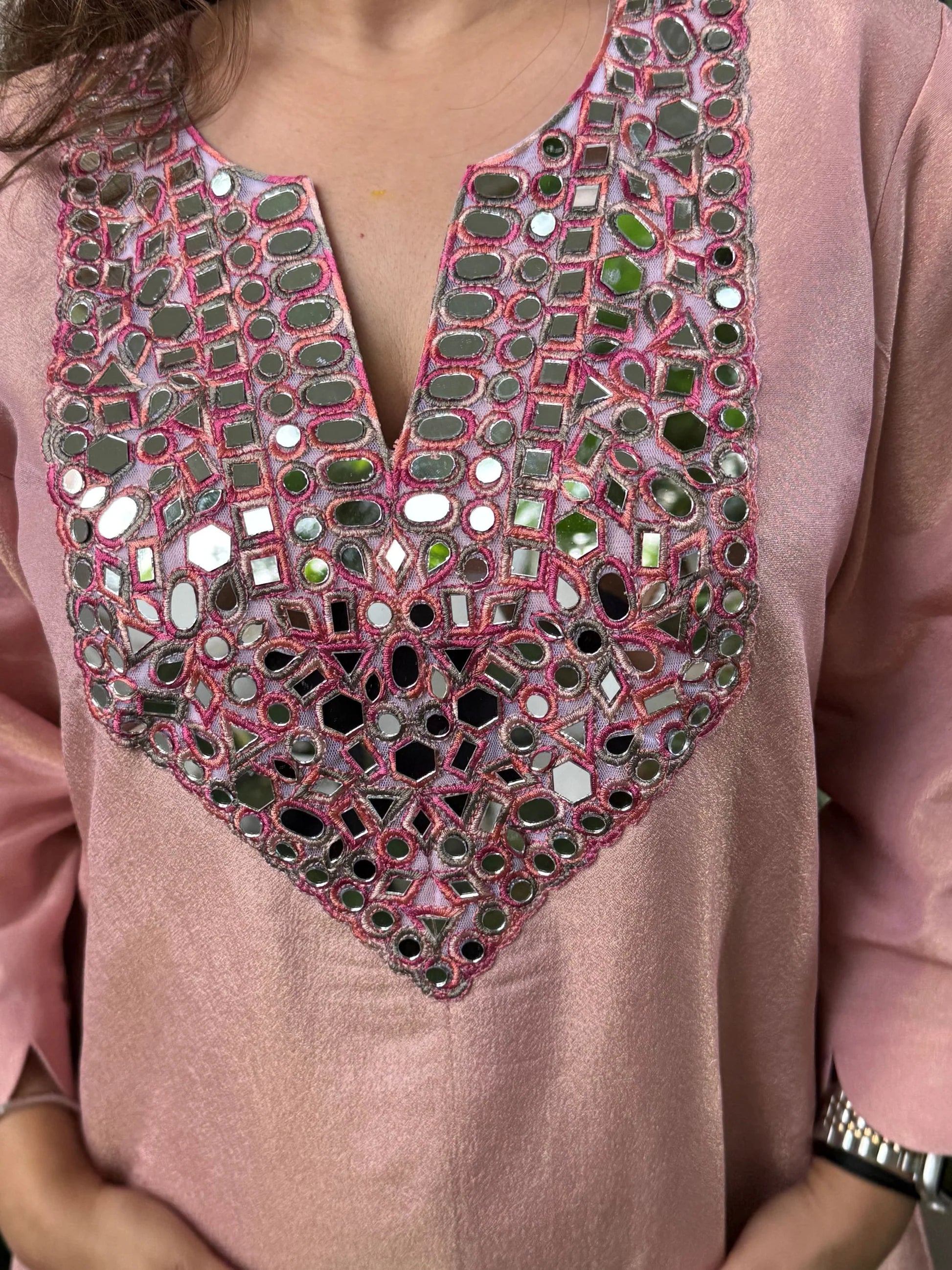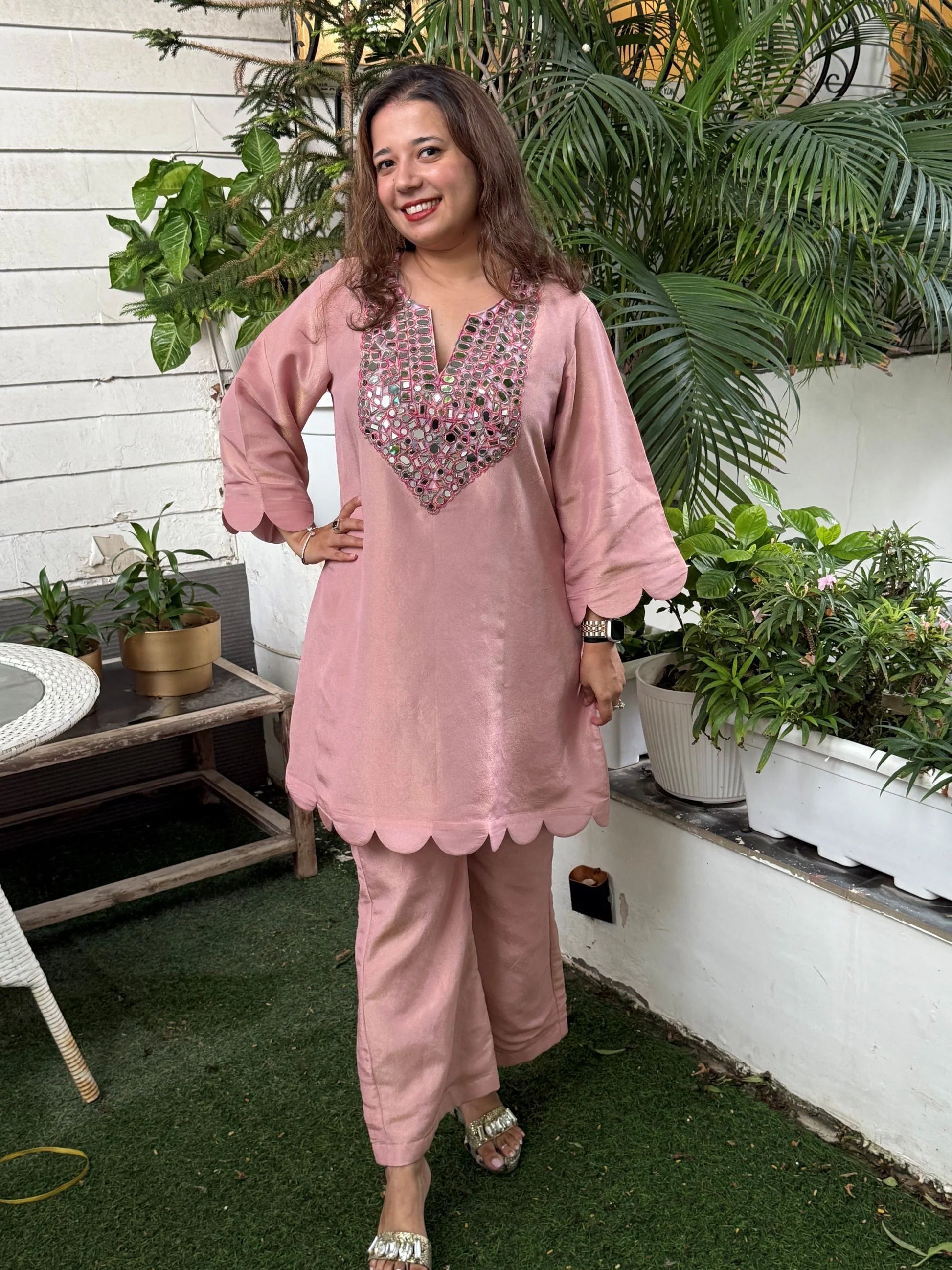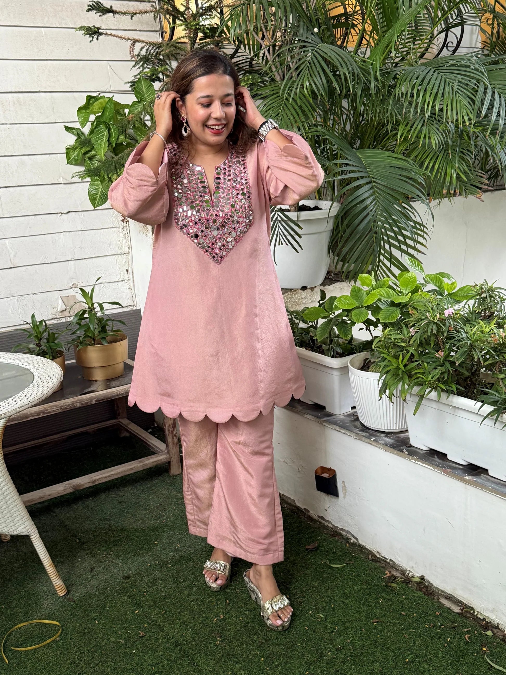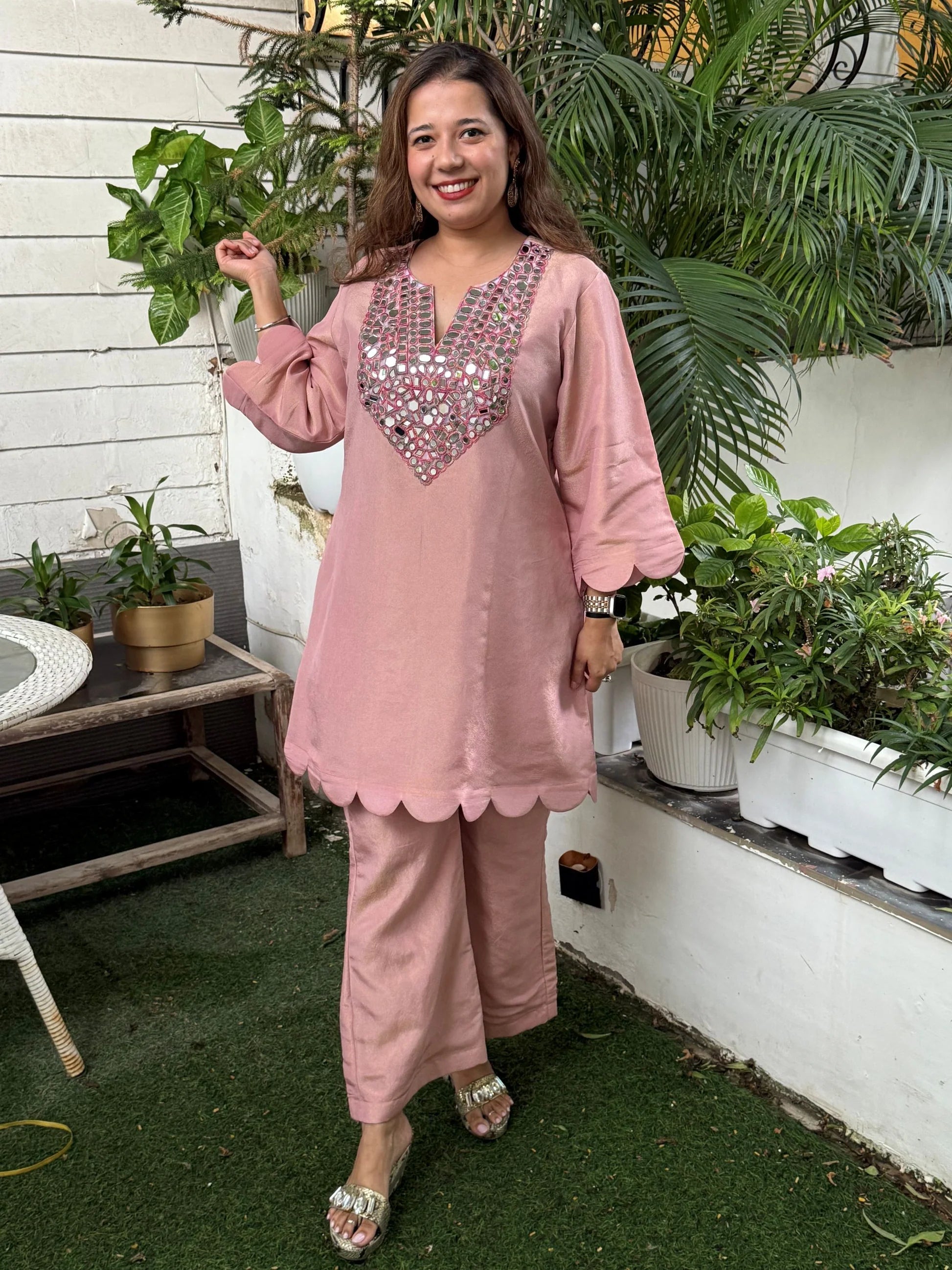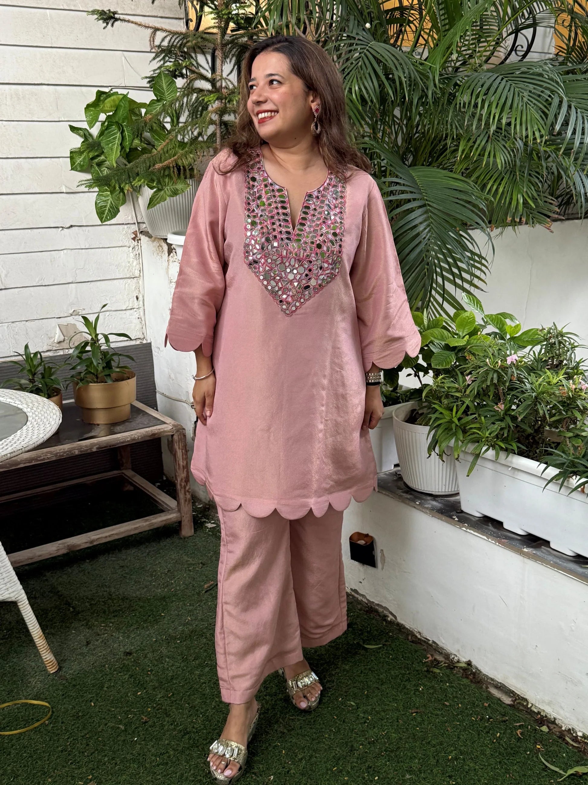 The Blush Pink Tissue Scalloped Mirror Set blends delicate luxury with graceful modern styling. Tailored in lightweight tissue fabric, it offers a refined shimmer and a relaxed, comfortable fit that feels effortlessly festive. The V-neck design highlighted with scalloped mirror work adds a touch of traditional sparkle without overwhelming the look. Perfect for intimate celebrations, poojas, festive gatherings, and elegant daytime functions, this set radiates charm through its soft pink sheen and refined detailing.
