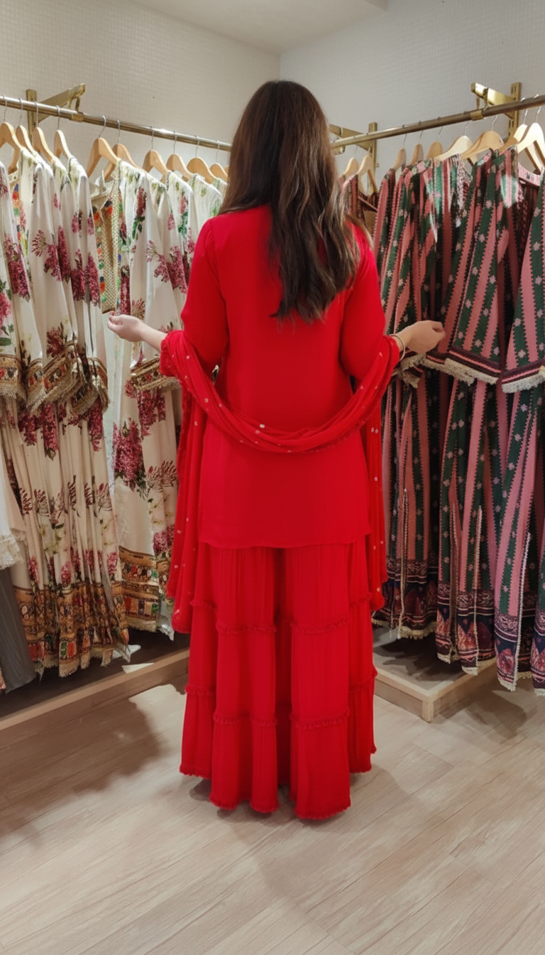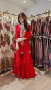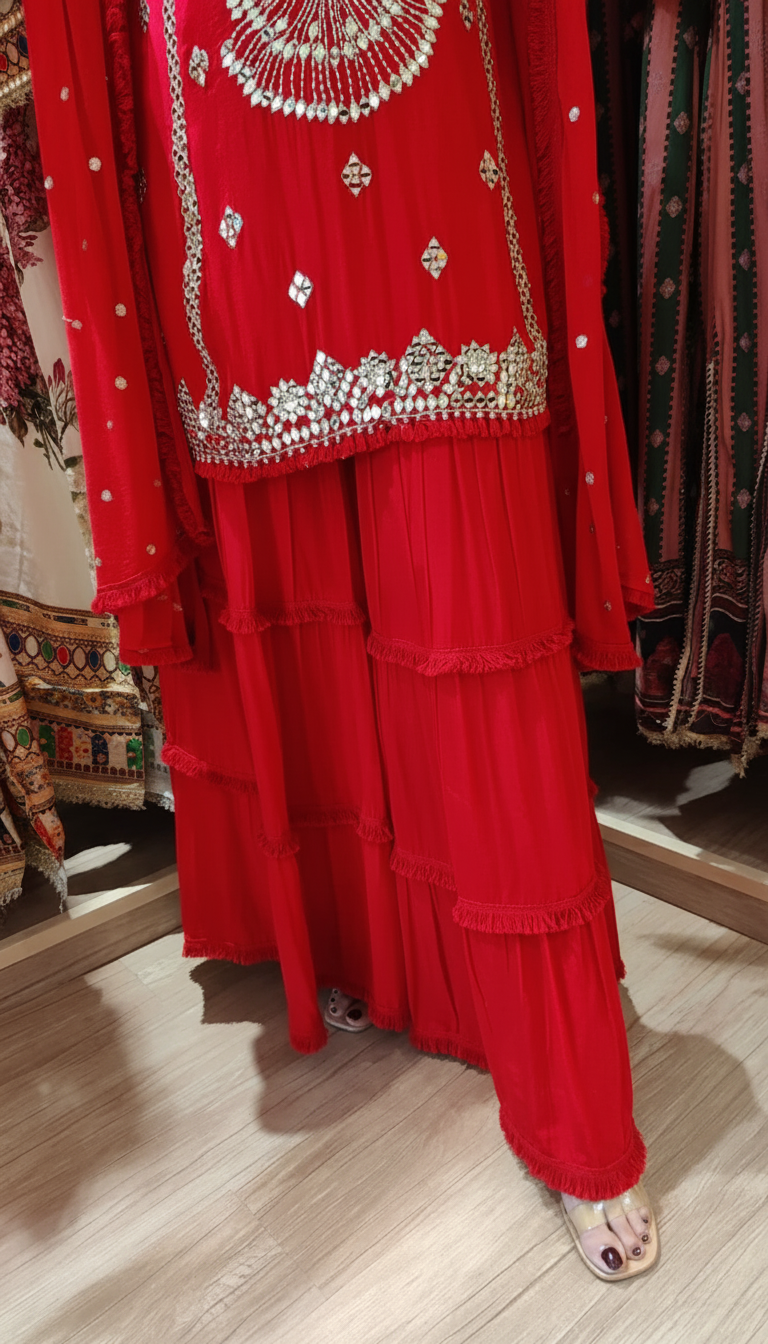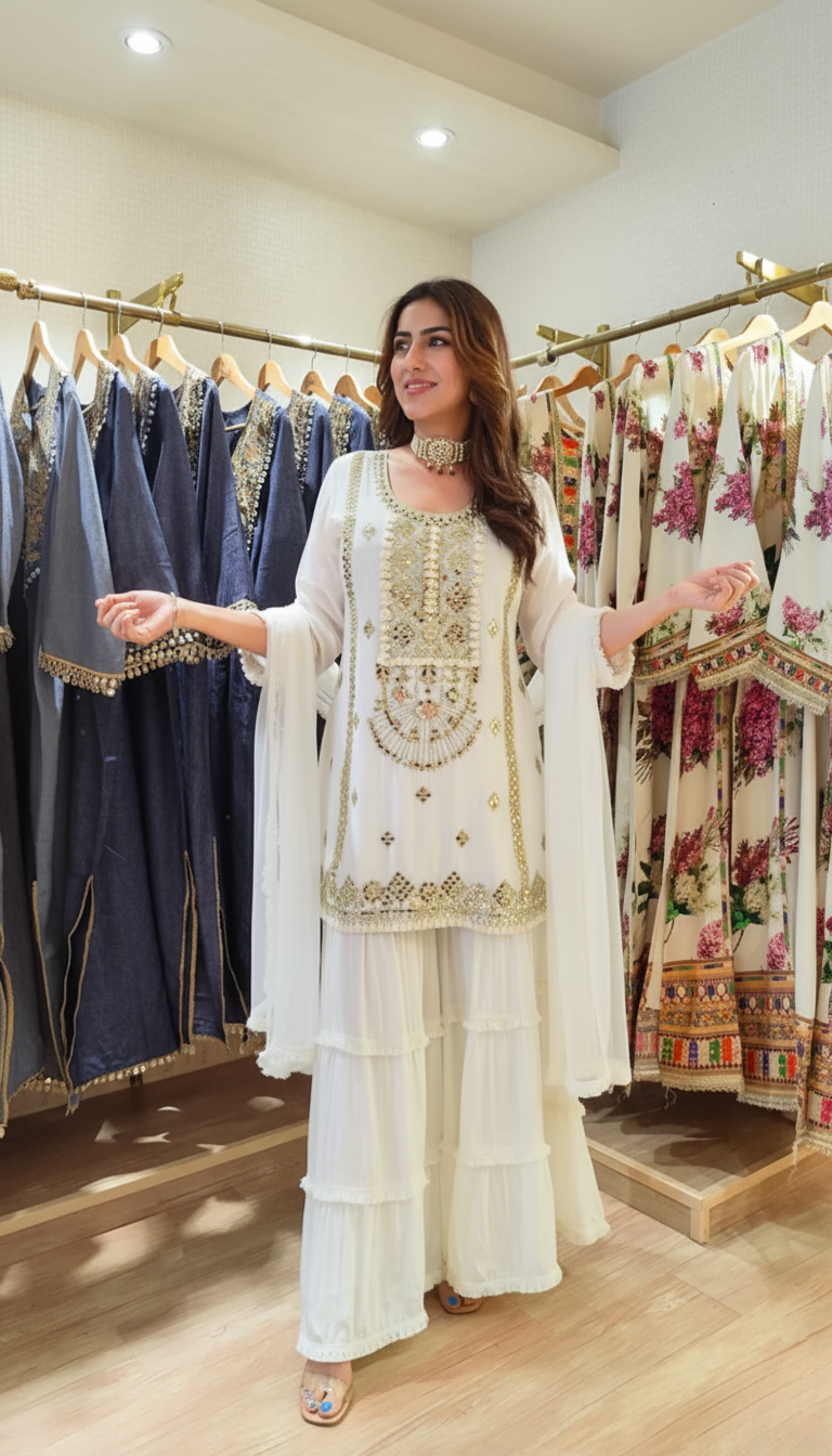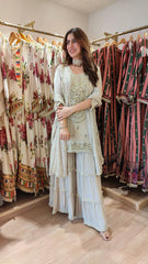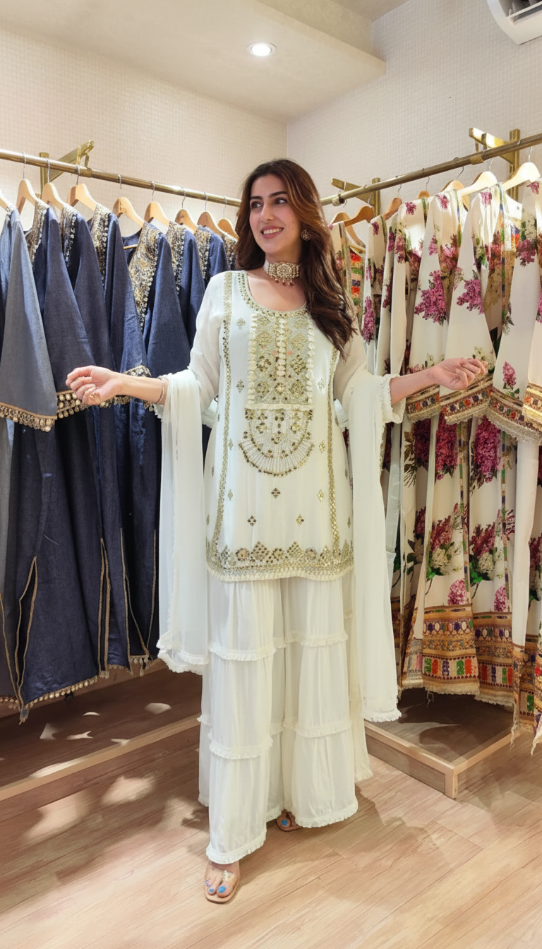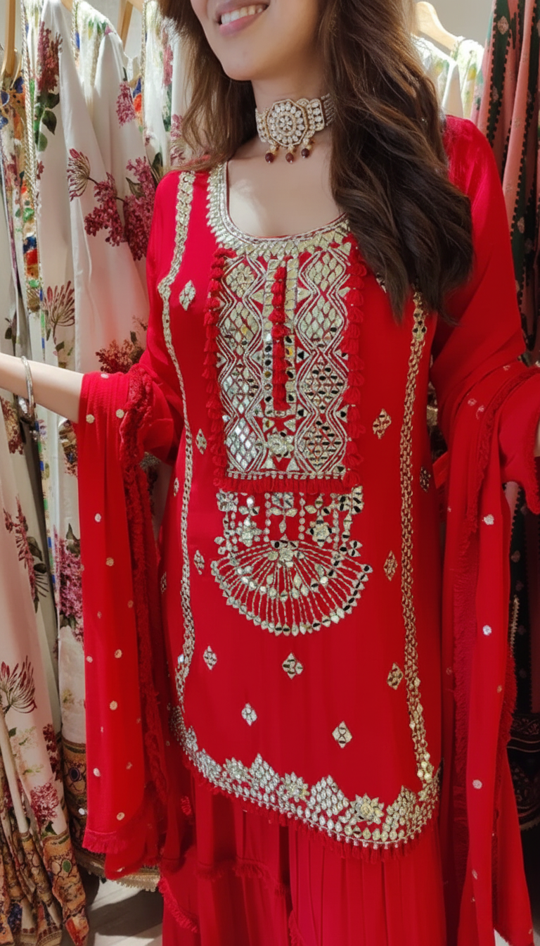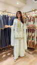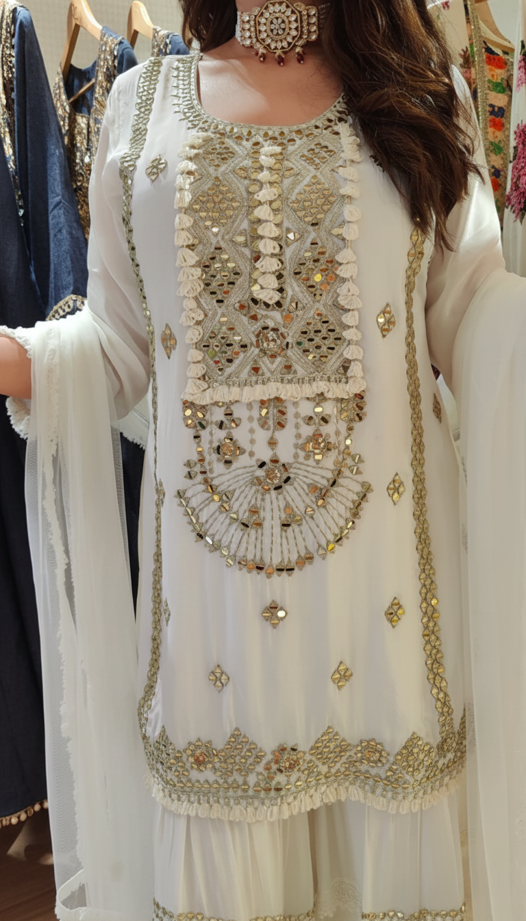 The Champagne Grey Mirror Work Sharara Set is a luxurious three-piece ensemble that blends elegance and festive charm. Crafted from premium Natural Crepe, the outfit features a beautifully tailored kurta, flowing sharara pants, and a soft chiffon dupatta. Each element is intricately hand-embroidered with real mirror work, kasab gold detailing, and delicate resham tassels creating a radiant yet refined look. Designed for comfort and grace, this ensemble is perfect for wedding functions, festive events, and elegant evening occasions.