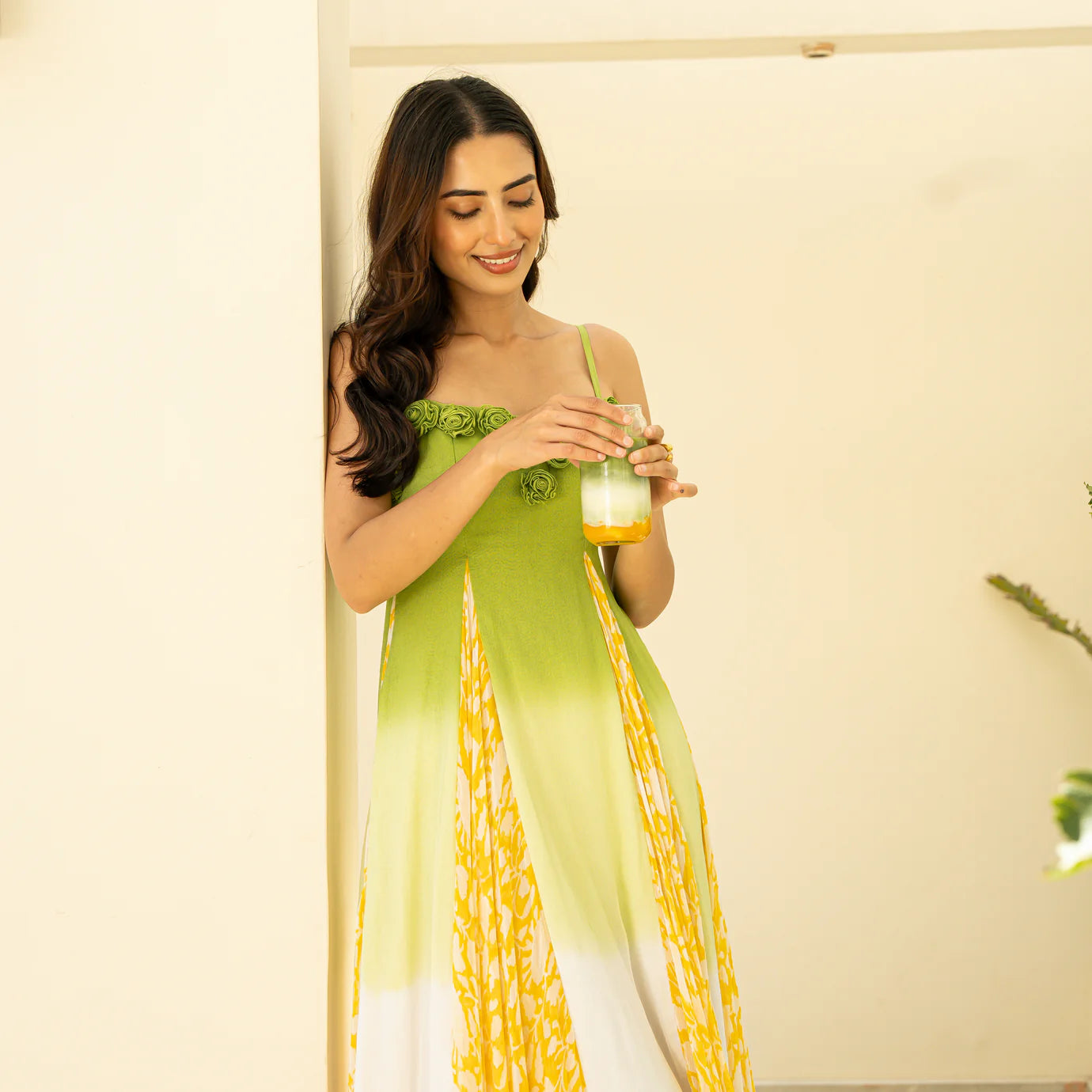 Step into breezy sophistication with the Ceremonial Bloom Godet Dress, crafted from lightweight chiffon in sunny yellow with subtle white and green shaded panels. The delicate rose embroidery along the sweetheart neckline adds a feminine, romantic touch, while the strappy design and godet silhouette create graceful movement and flattering proportions. Perfect for daytime events, garden parties, or any occasion where effortless elegance meets contemporary charm, this dress exudes timeless style and playful sophistication.
