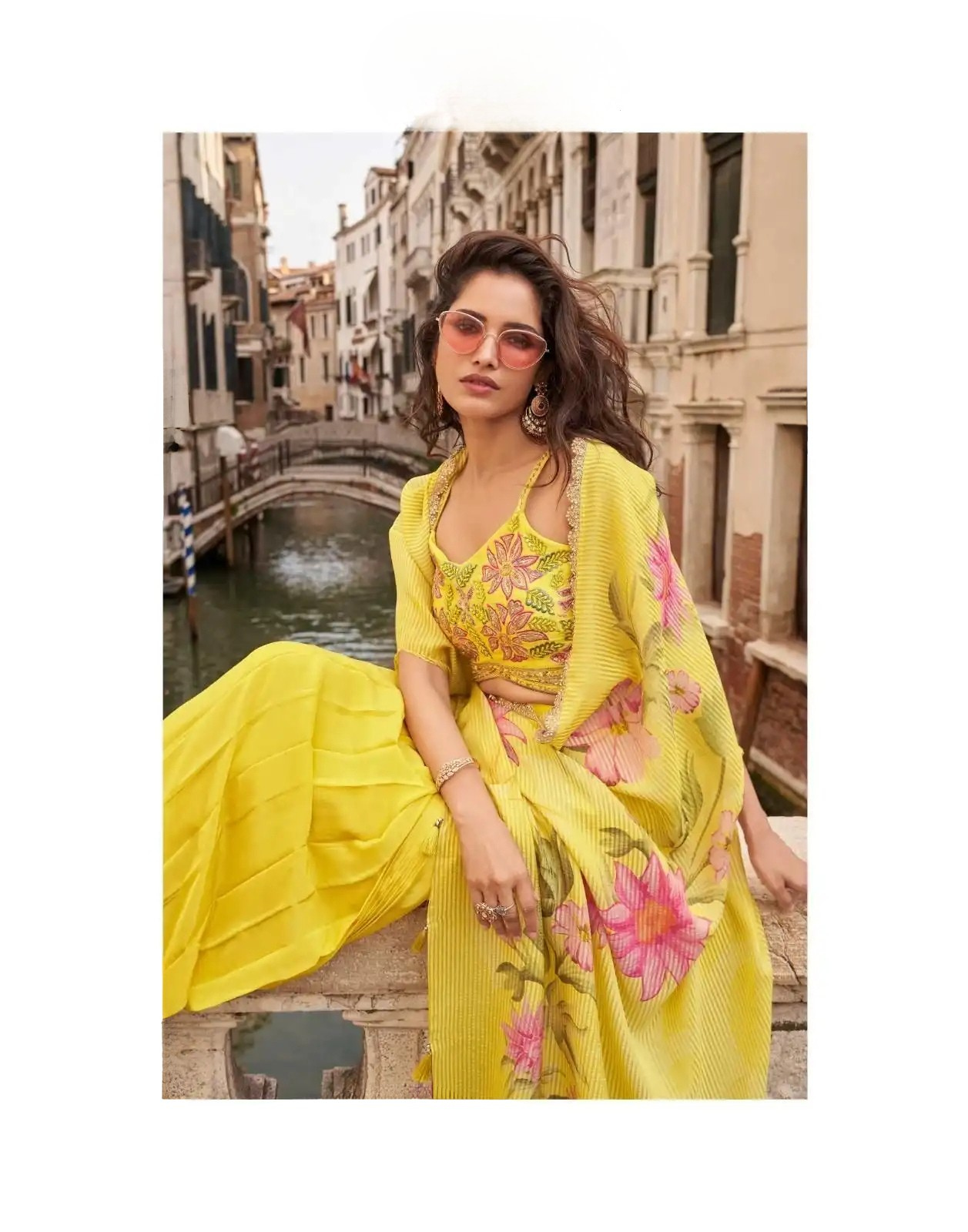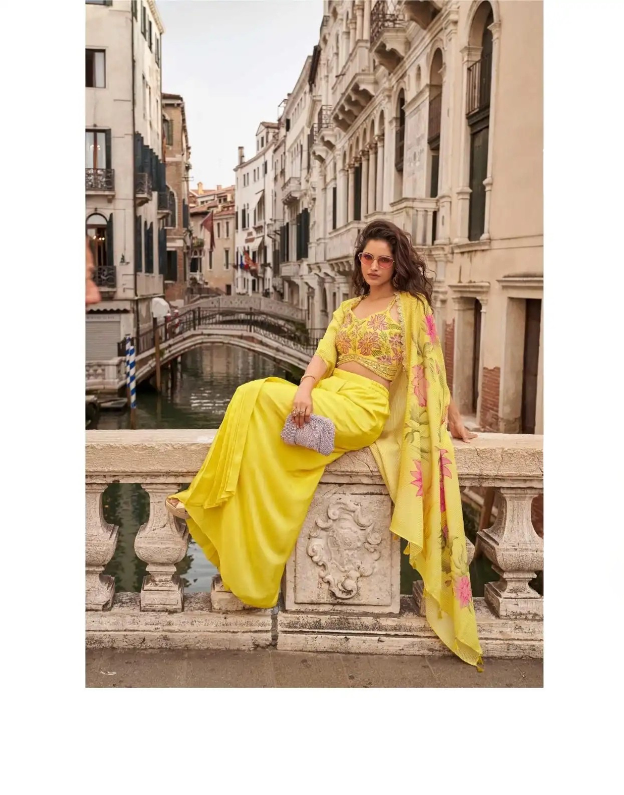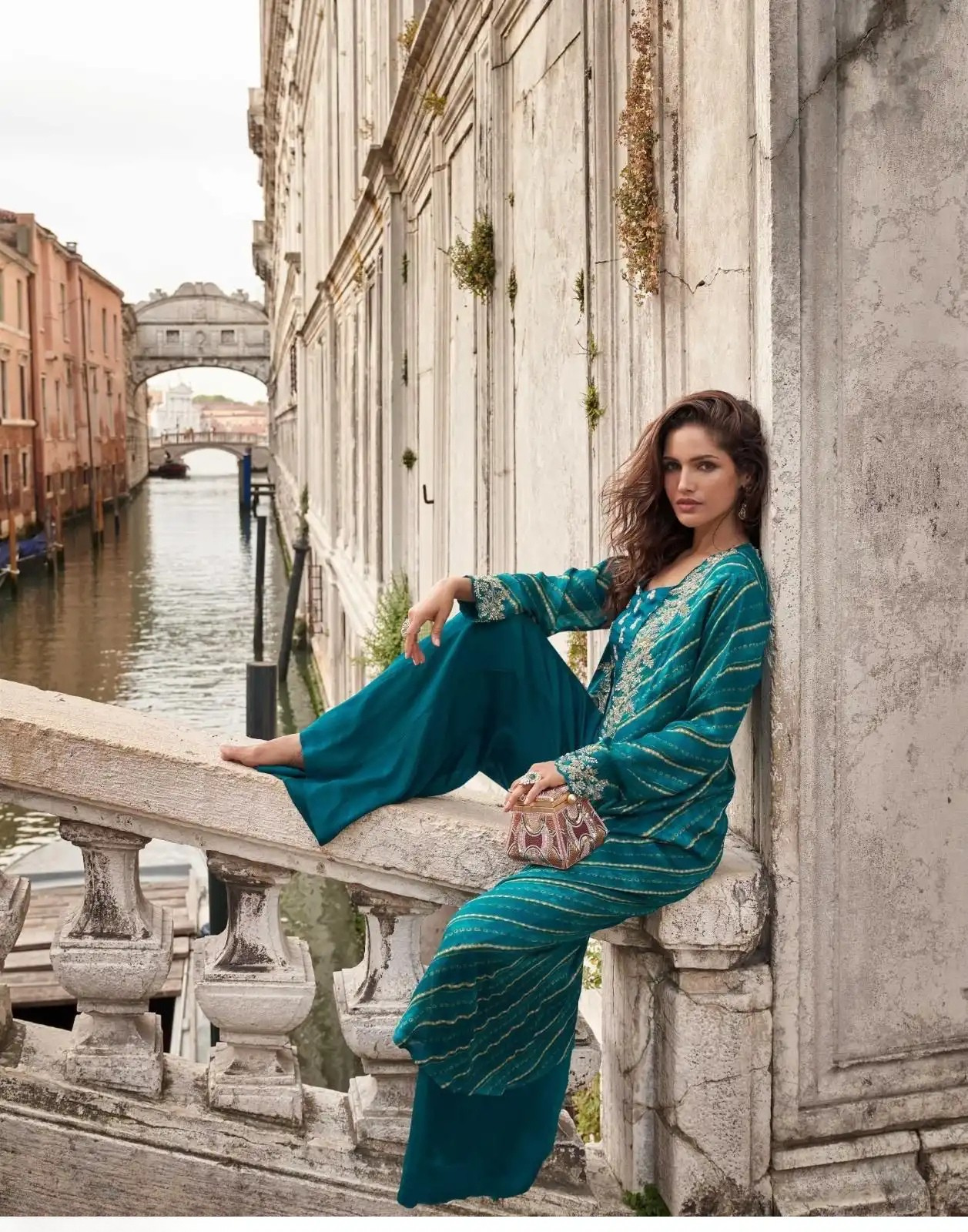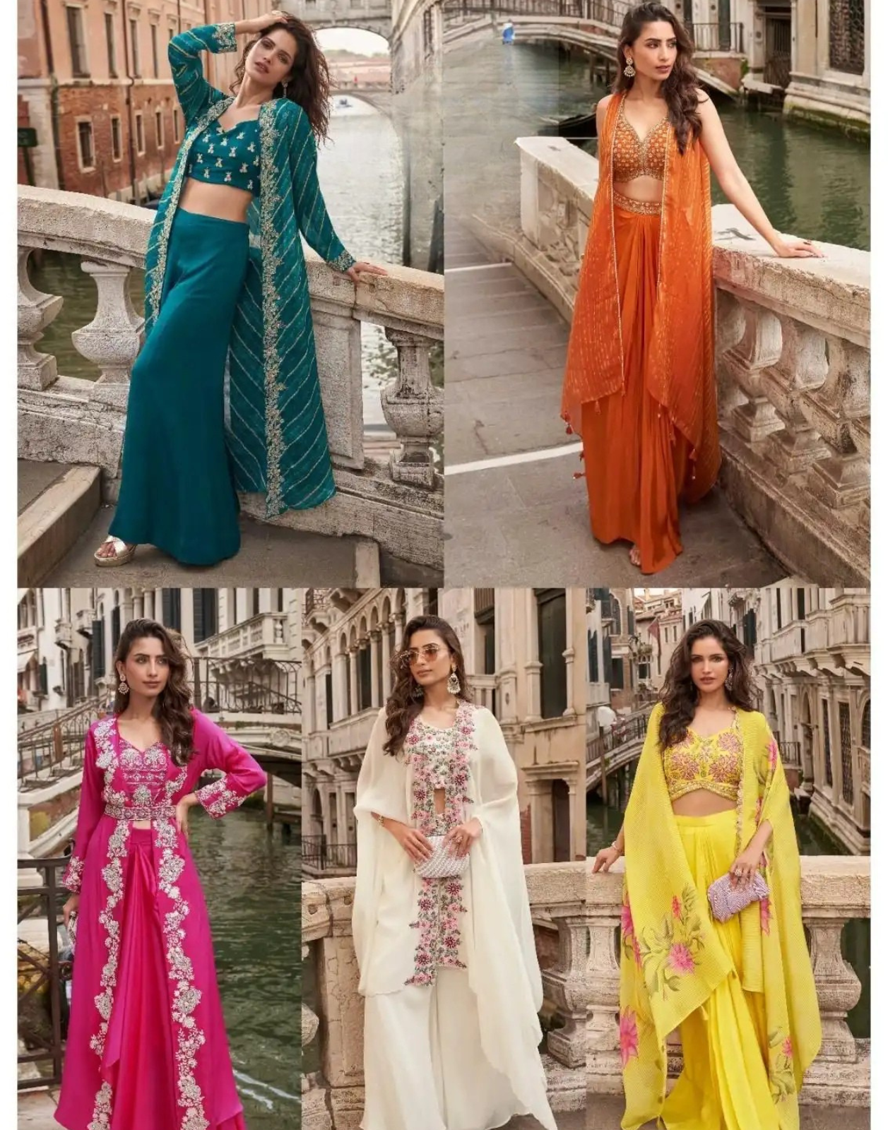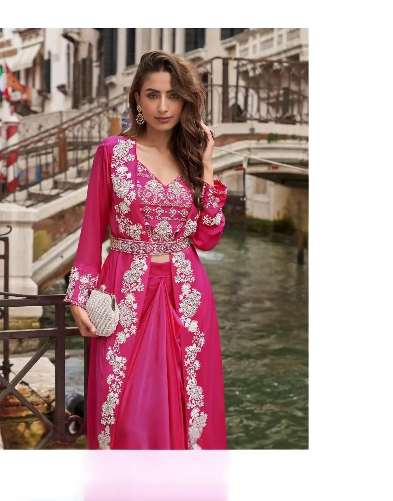 The Chinnon Silk Embroidered Western Set brings together modern styling and rich festive detailing. Designed in premium real Chinnon silk and viscose jacquard silk, this free-size stitched 5-piece set includes an intricately embroidered shrug, a mirror-embellished blouse, a stylish palazzo, and coordinated components that complete the look. Perfect for festive occasions, celebrations, and elegant gatherings, it offers a bold blend of tradition and contemporary fashion.
