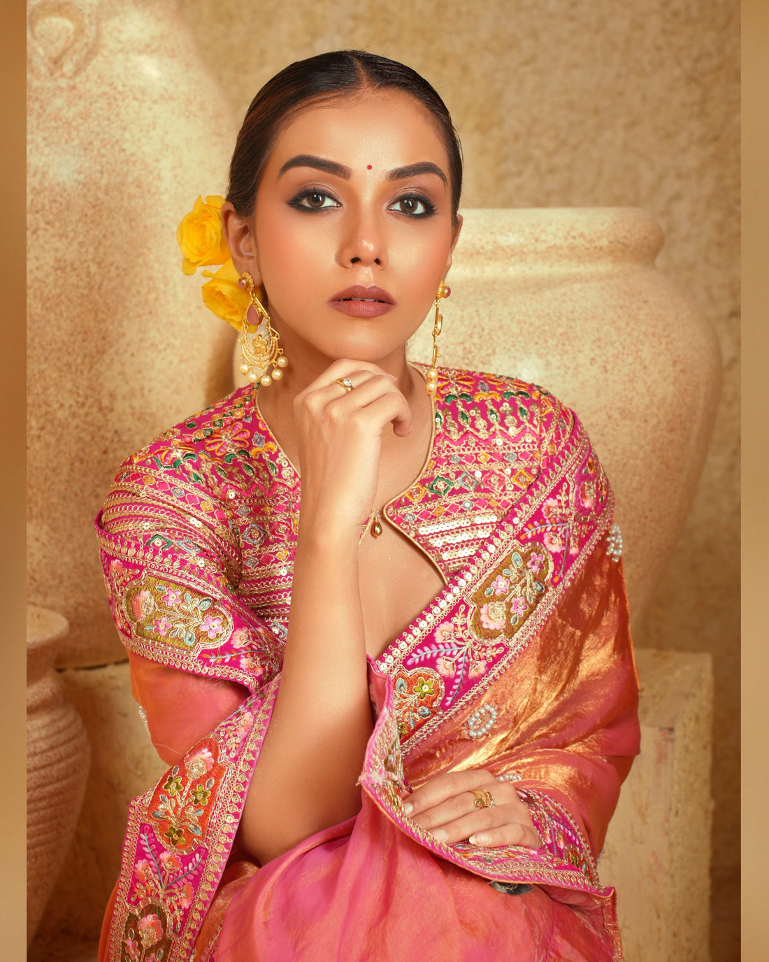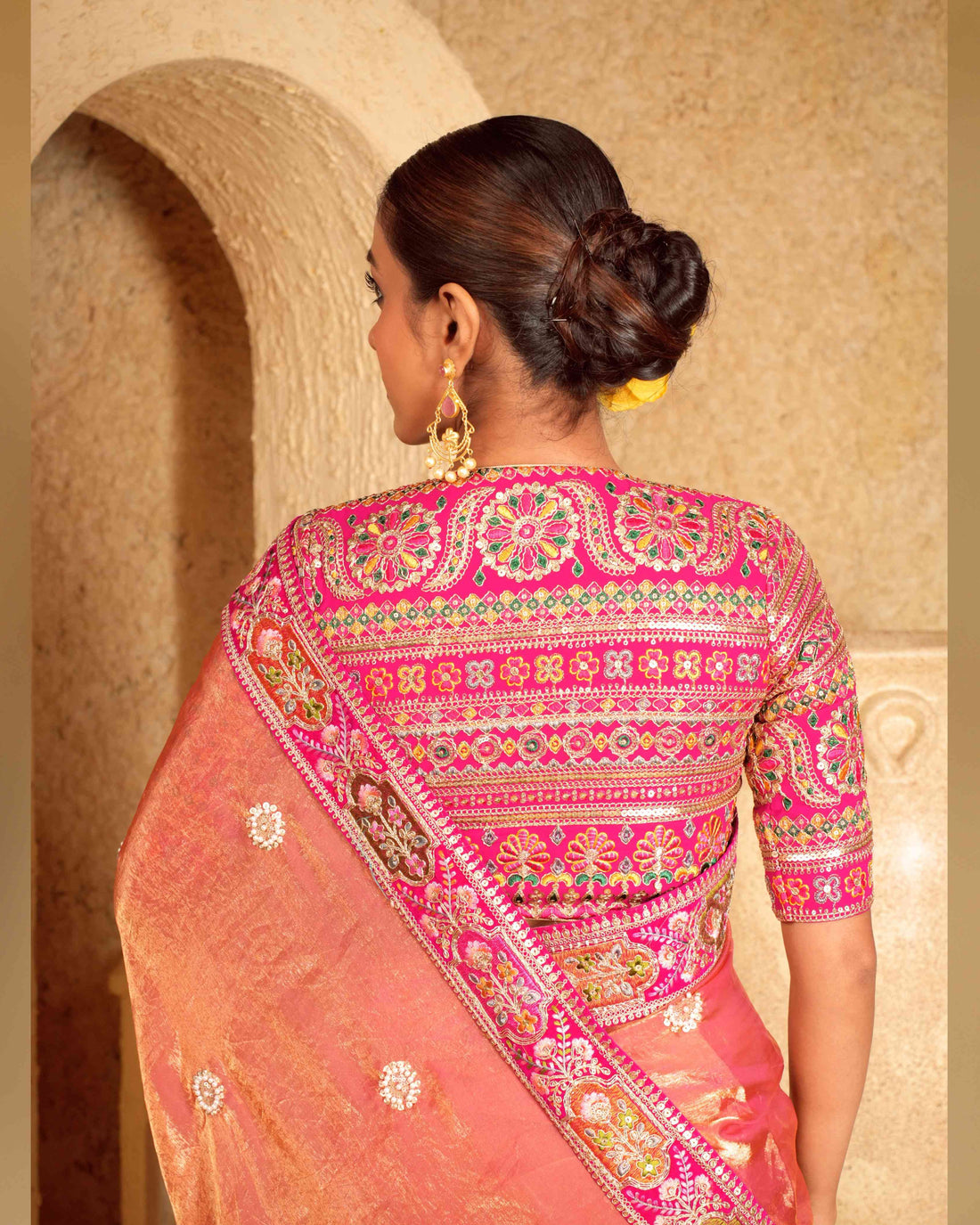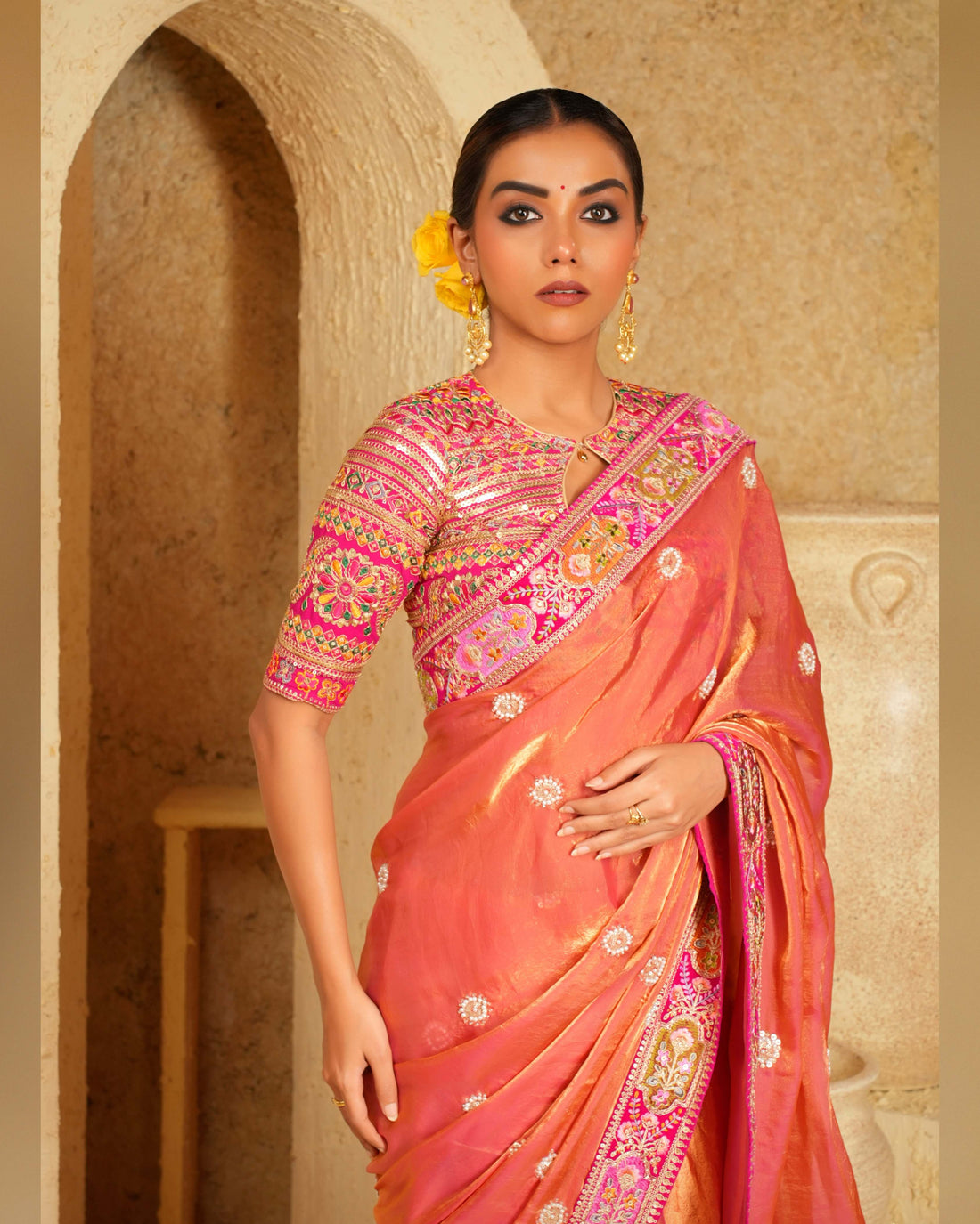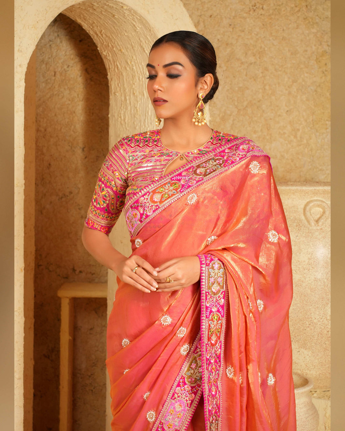 Paired with this saree is the stunning Raspberry Romance blouse. The blouse features multi-colour thread embroidery, golden zari accents, and sequin work on a soft pink georgette base. Its detailing matches beautifully with the coral saree, creating a cohesive, eye-catching outfit.