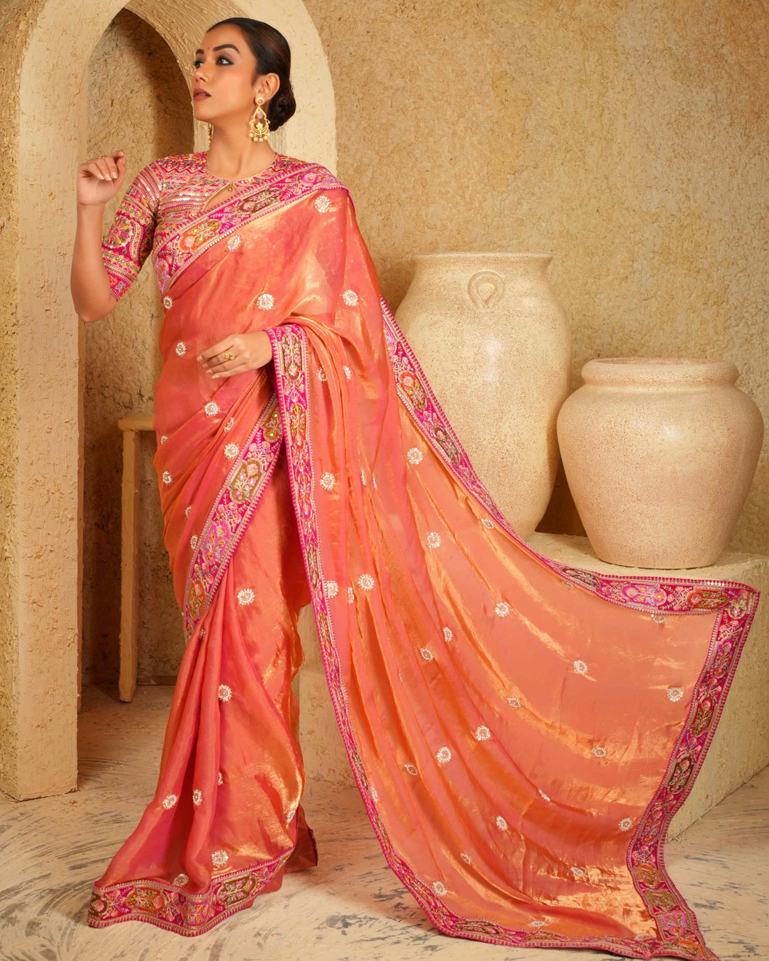 A refreshing blend of charm and vibrance, the Coral Charisma Saree With Raspberry Romance Blouse offers a beautiful fusion of textures and tones. The dual-tone coral butter metallic tissue saree shimmers softly, perfect for celebrations and festive moments.