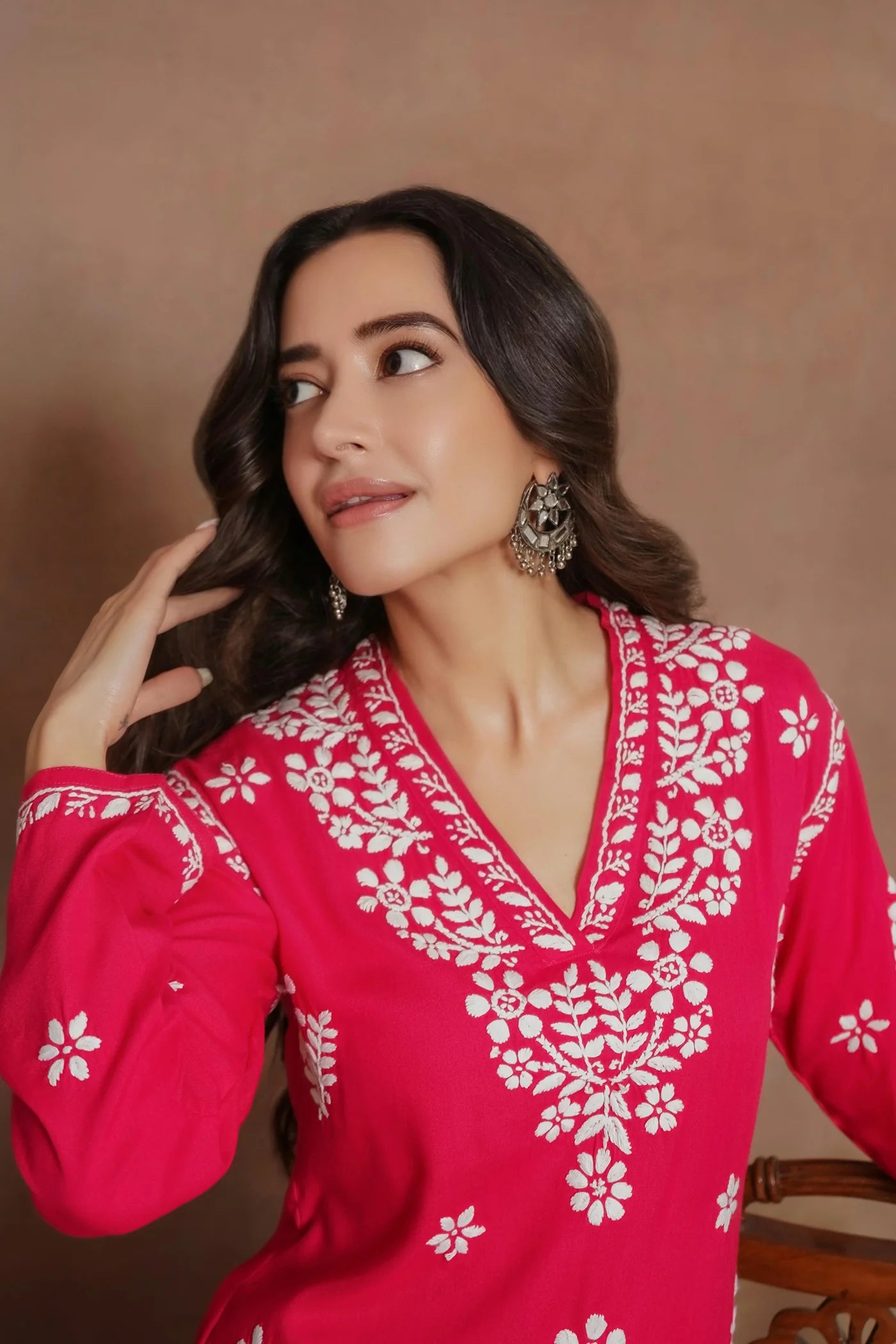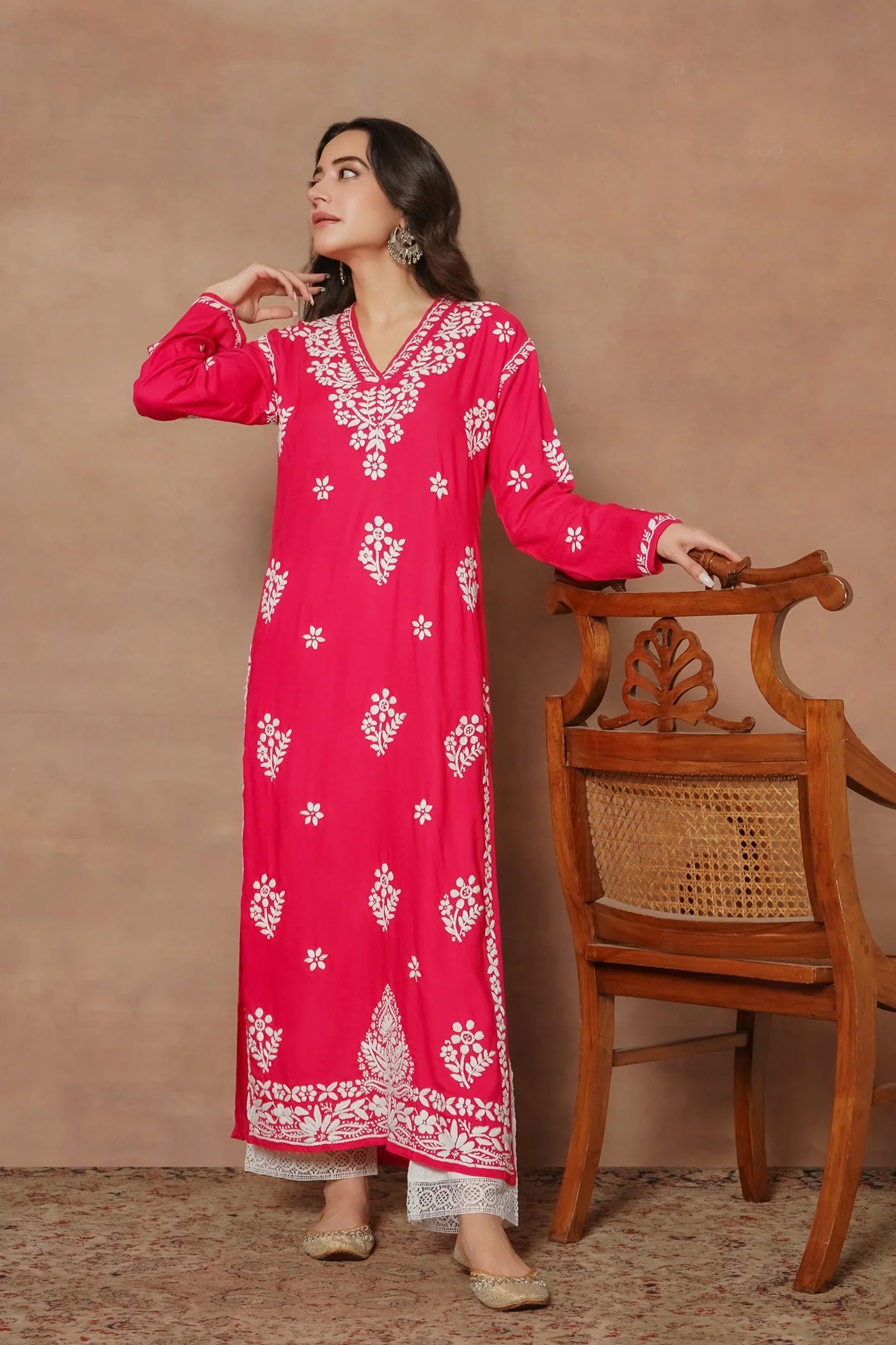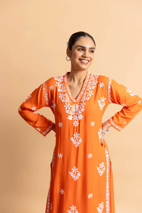 Step into timeless elegance with this Blossom Pink Chikankari Kurta, crafted from soft, breathable cotton for all-day comfort. The intricate hand-embroidered chikankari work adds a delicate, artisanal charm, while the flattering V-neckline enhances the feminine silhouette. Perfectly tailored for a relaxed fit, this kurta offers graceful movement and effortless style. Ideal for festive occasions, casual outings, or daytime gatherings, it combines traditional artistry with modern elegance.
