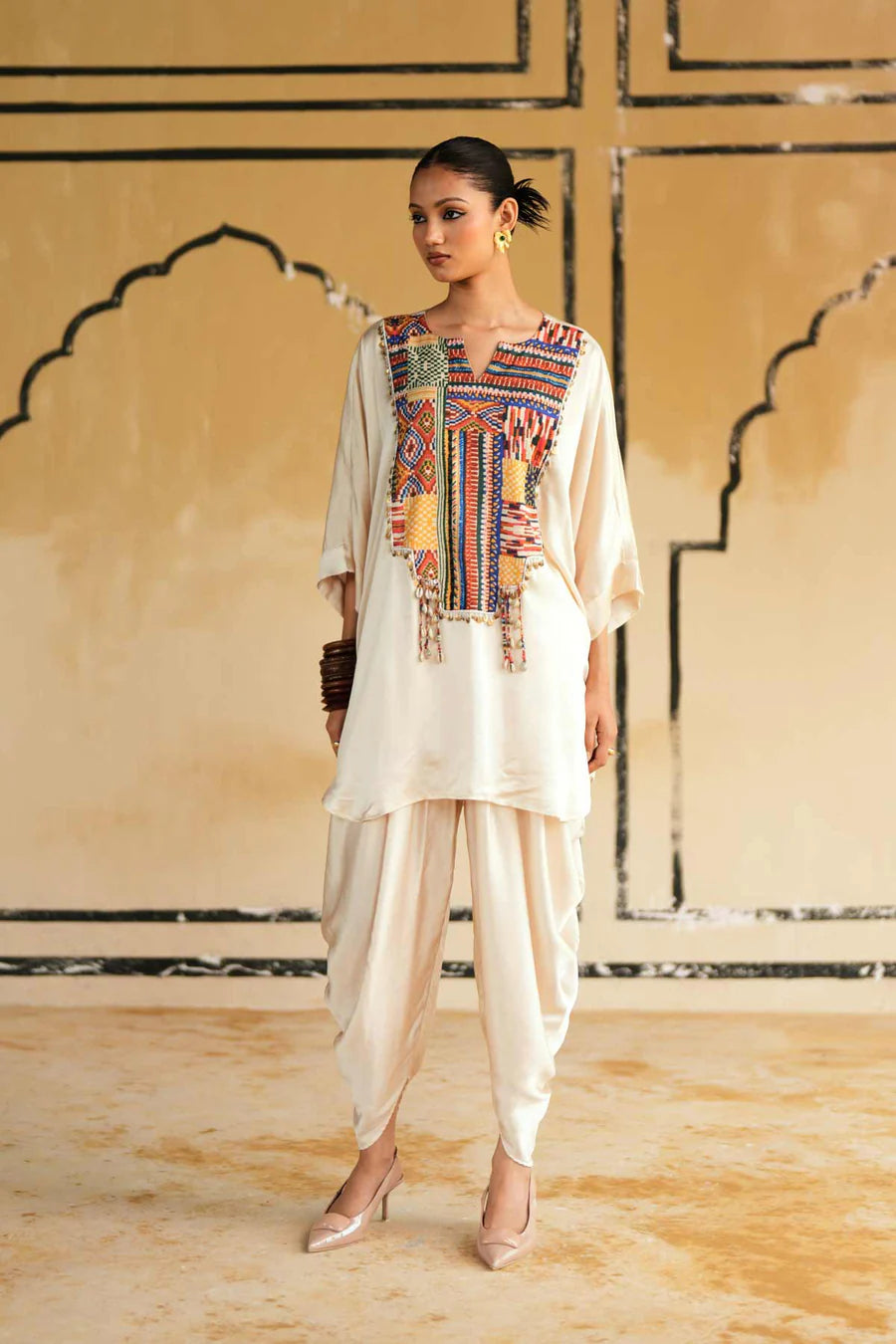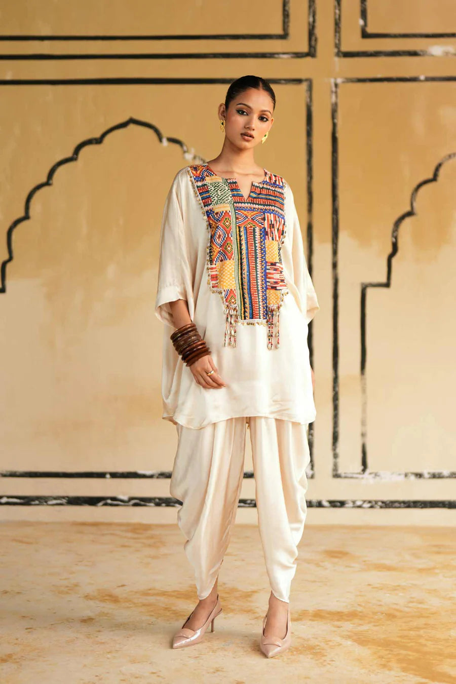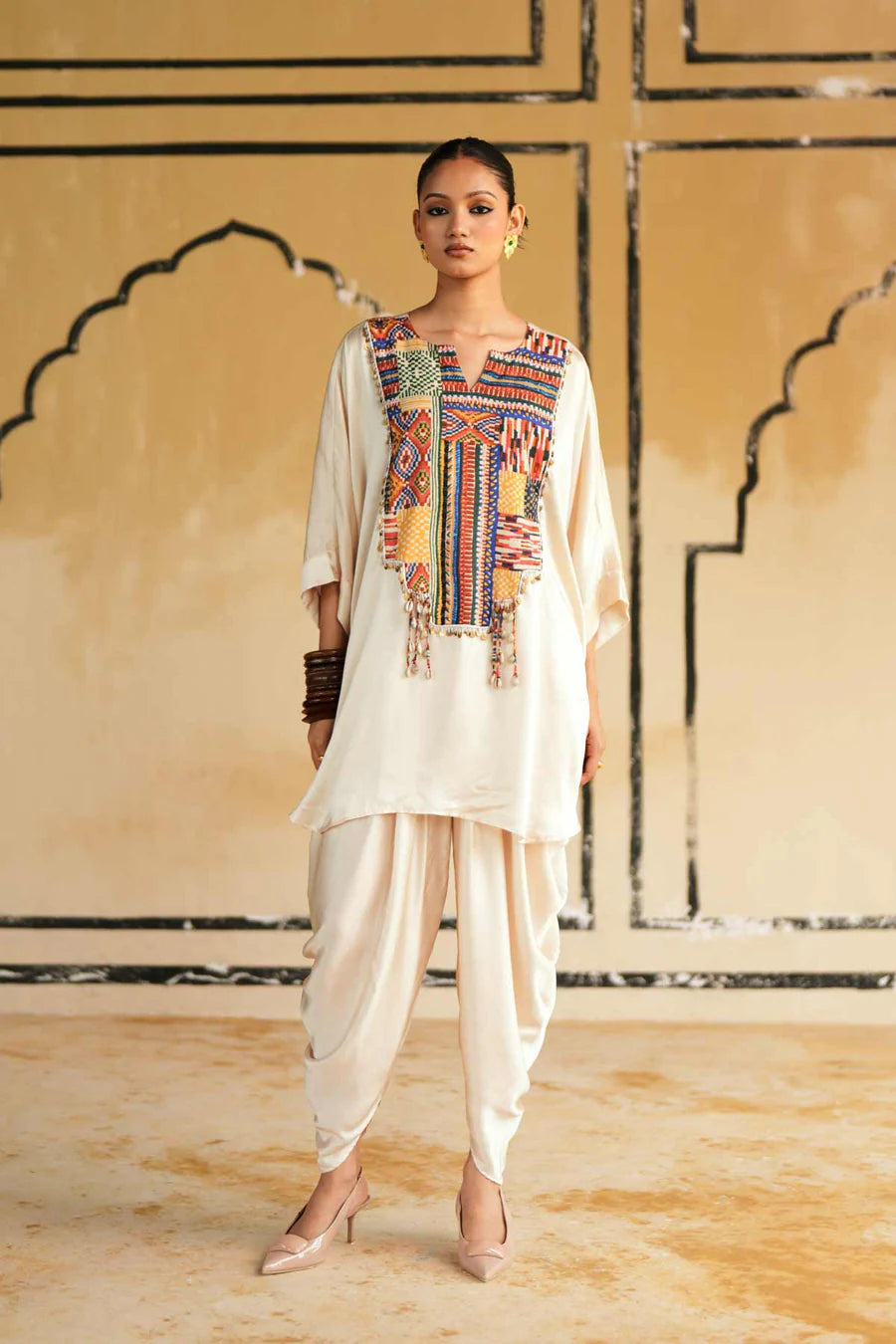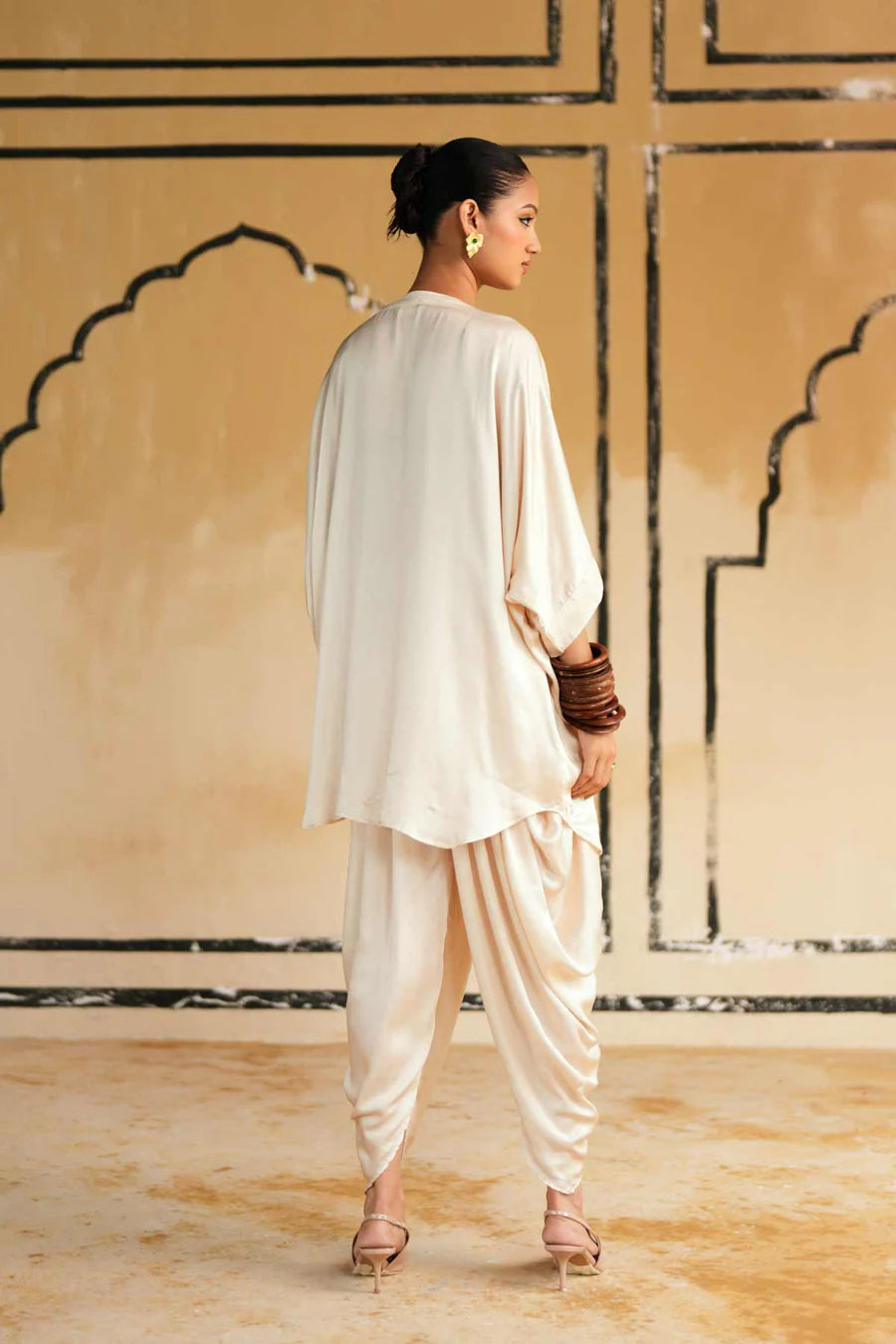 Add this Cream Satin Marusthal Muse Top & Pant/Dhoti Set to your wardrobe for effortless elegance, versatile styling, and all-day luxurious comfort.