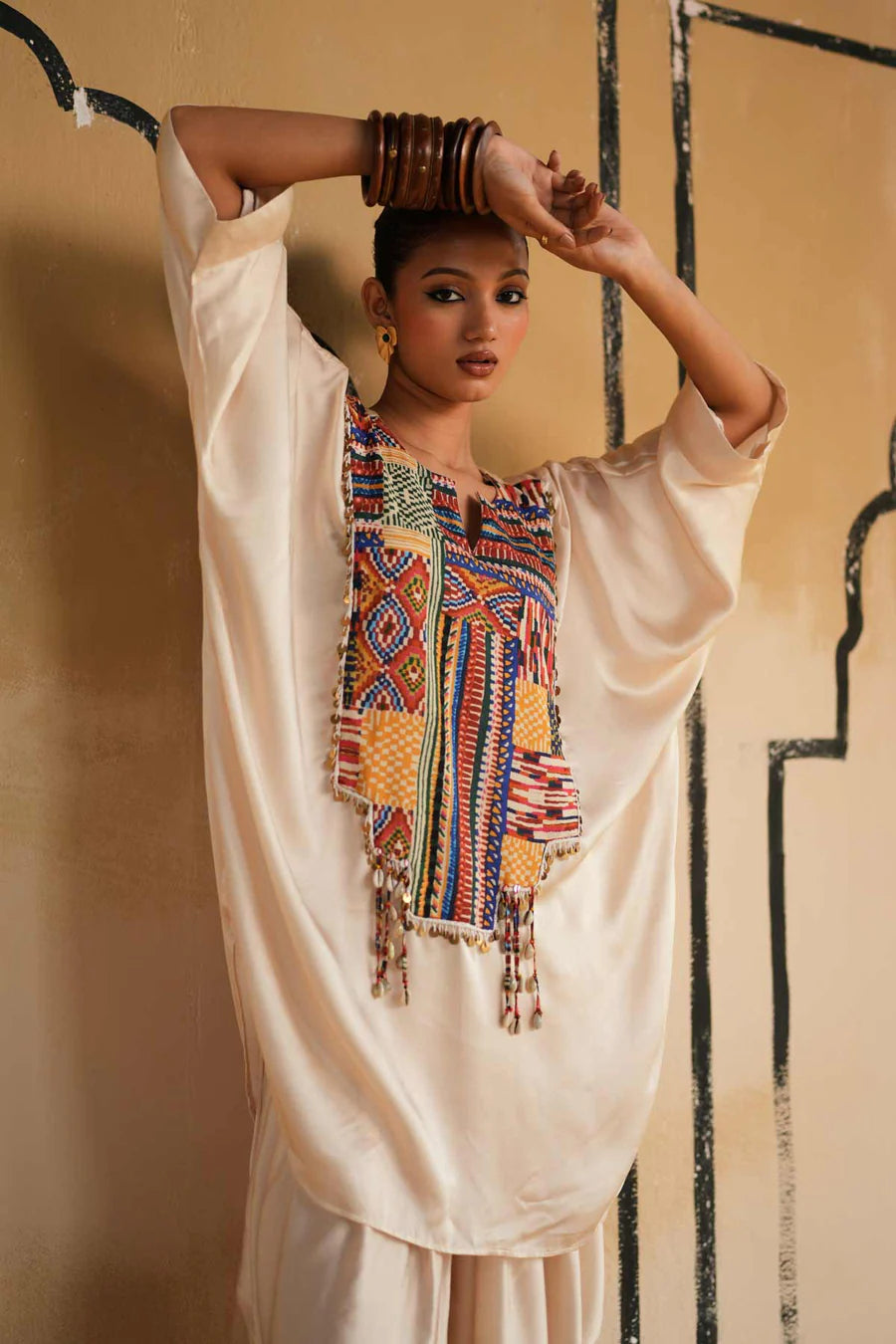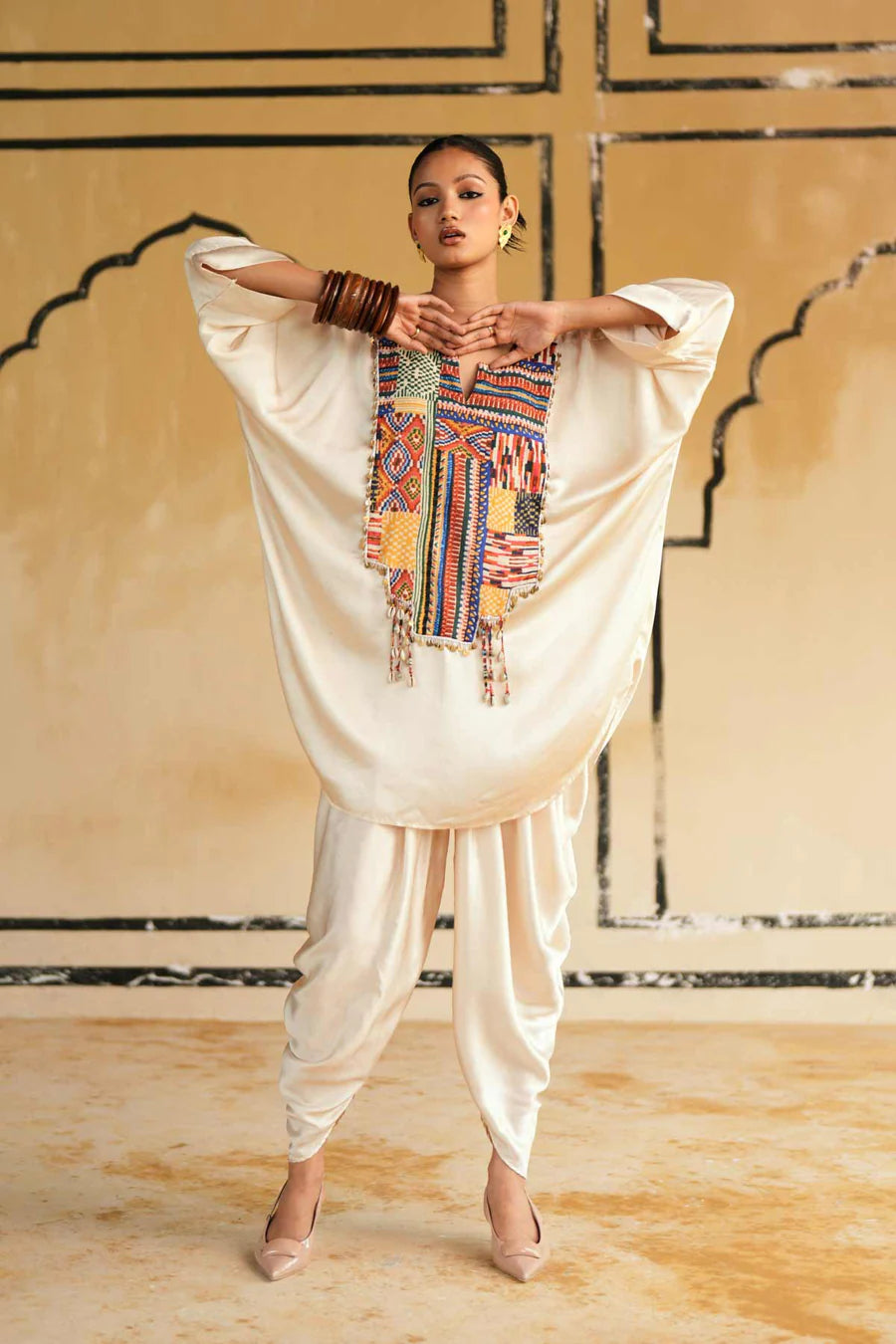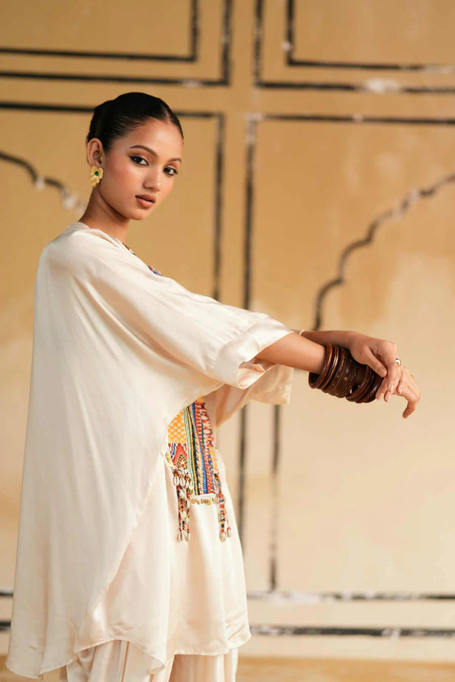 Add this Cream Satin Marusthal Muse Top & Pant/Dhoti Set to your wardrobe for effortless elegance, versatile styling, and all-day luxurious comfort.