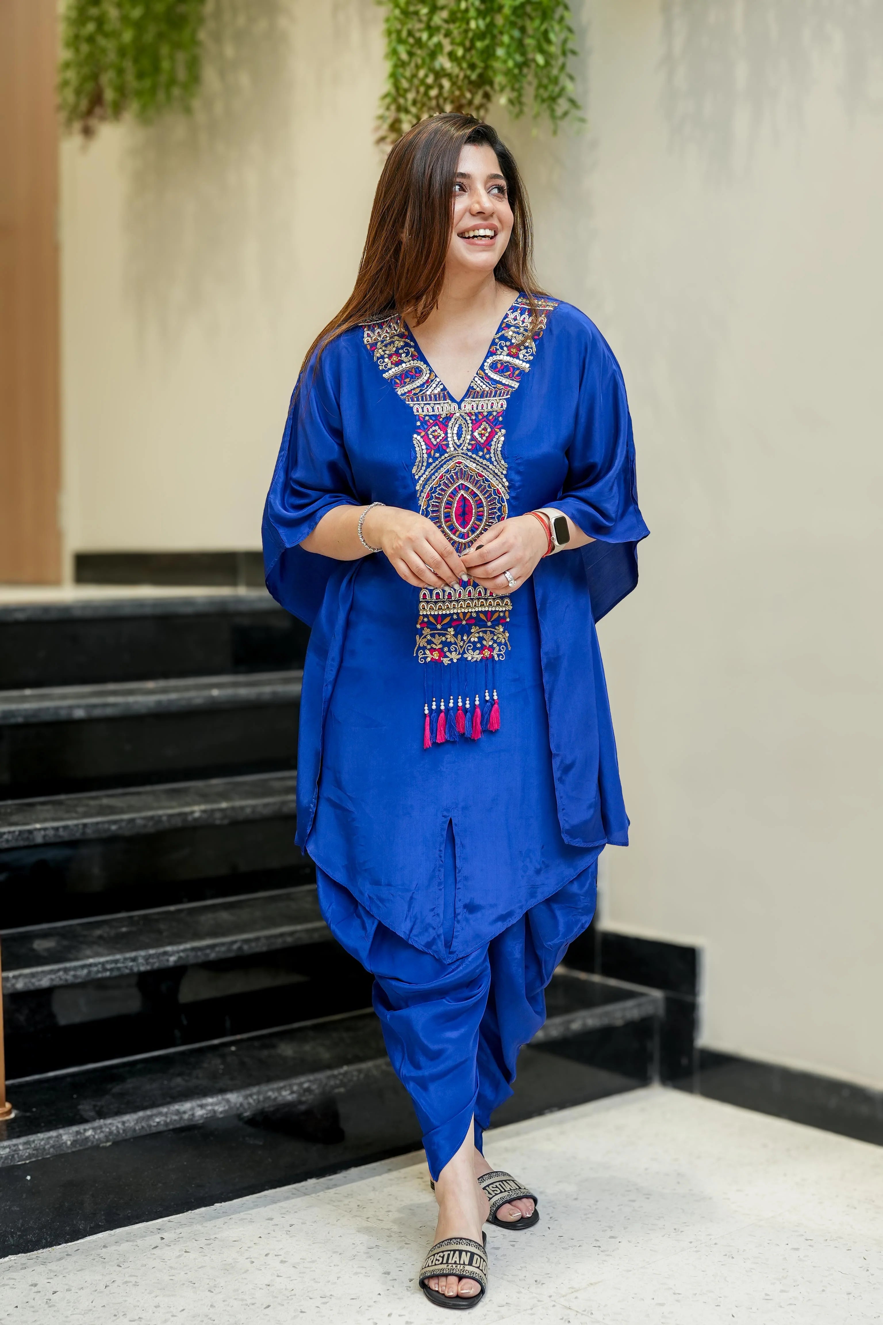 The Behma Blue Kaftan with Tulip Pants is a chic ensemble that combines contemporary style with traditional elegance. Crafted from premium crepe fabric, it offers a soft drape and comfortable fit, making it perfect for long hours of wear. The flowing kaftan top paired with tailored tulip pants creates a modern silhouette suitable for festive events, casual gatherings, or stylish office occasions.
