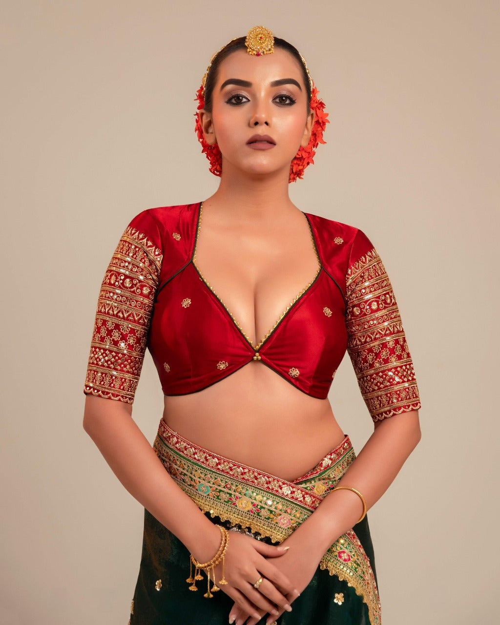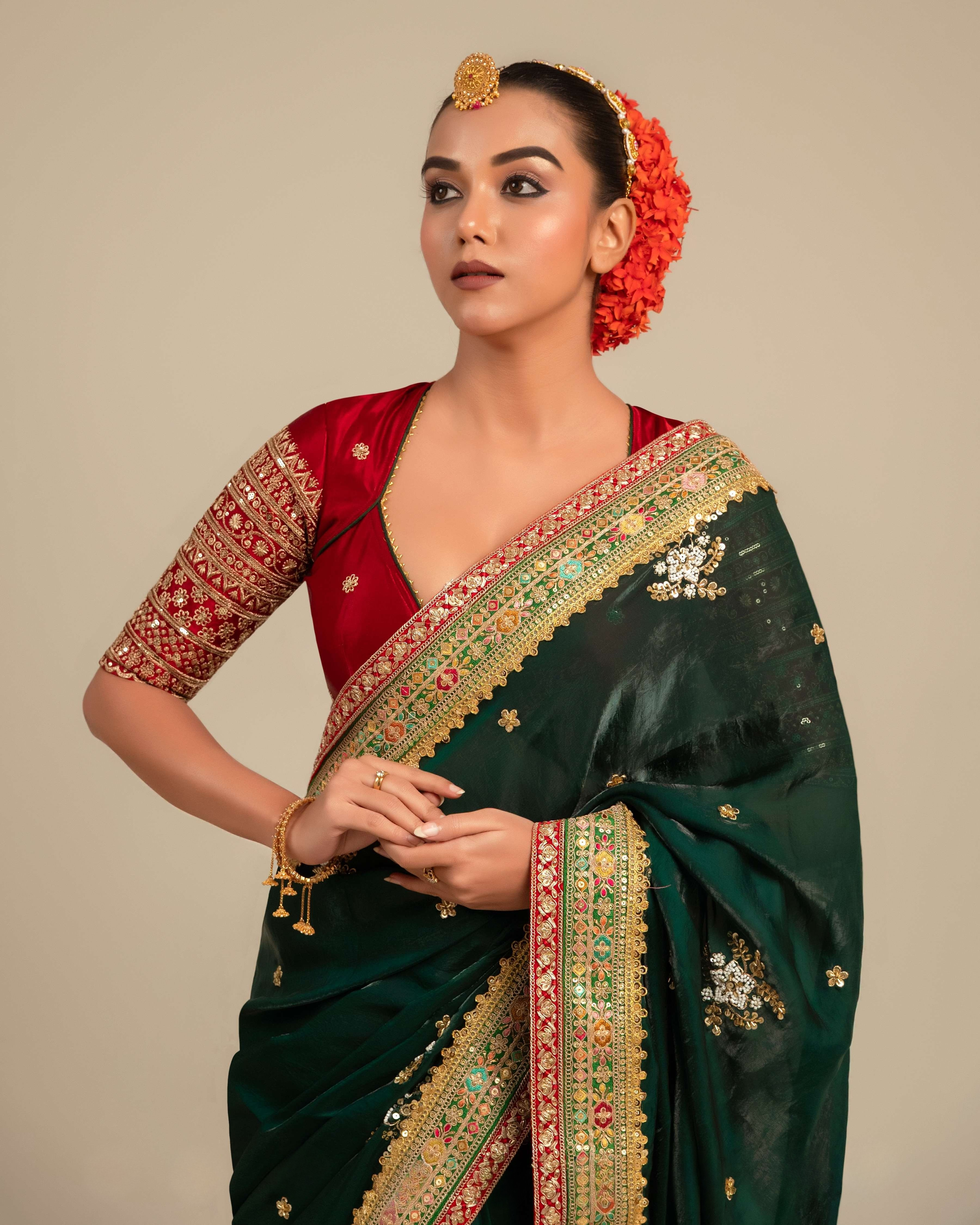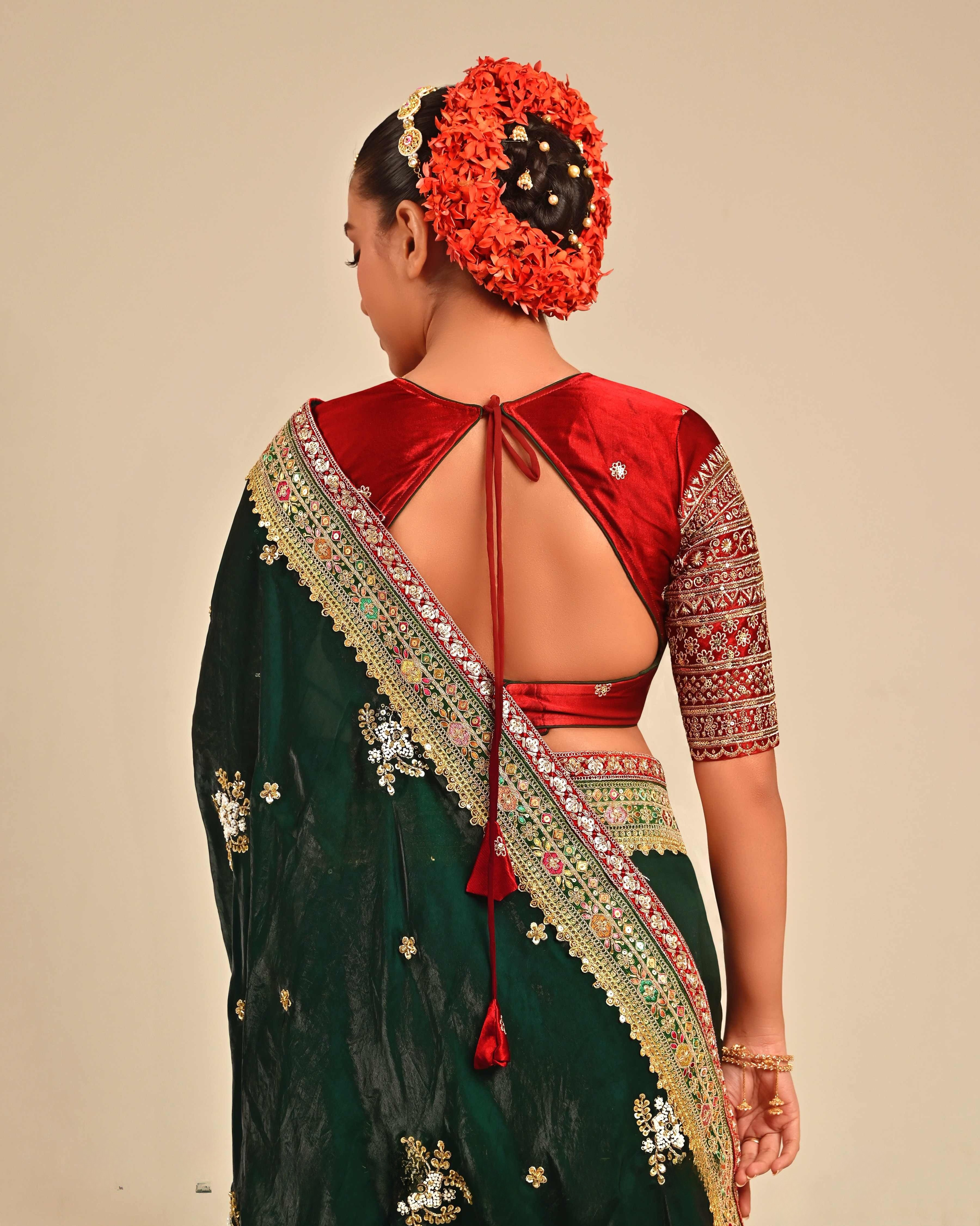 Add this Deep Red Gaji Silk Elbow Sleeve Blouse to your festive wardrobe for timeless elegance, luxurious detailing, and refined celebration style.