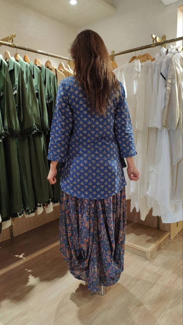 The Elegant Blue Drape Skirt Set combines effortless style with breathable comfort, crafted from 100% cambric cotton. Designed as a chic two-piece set, it features a stylish high-low top paired with a beautifully draped skirt. Available in classic blue and rich maroon, this outfit is perfect for casual outings, festive gatherings, or elegant daytime events.