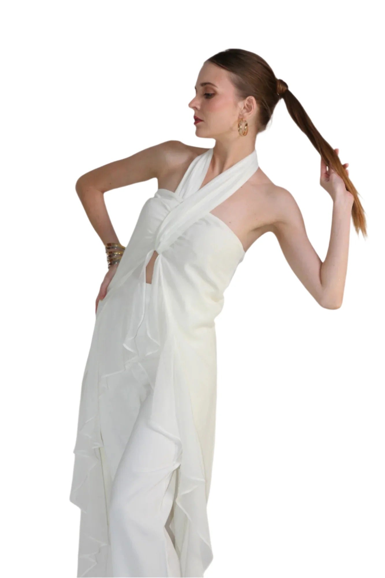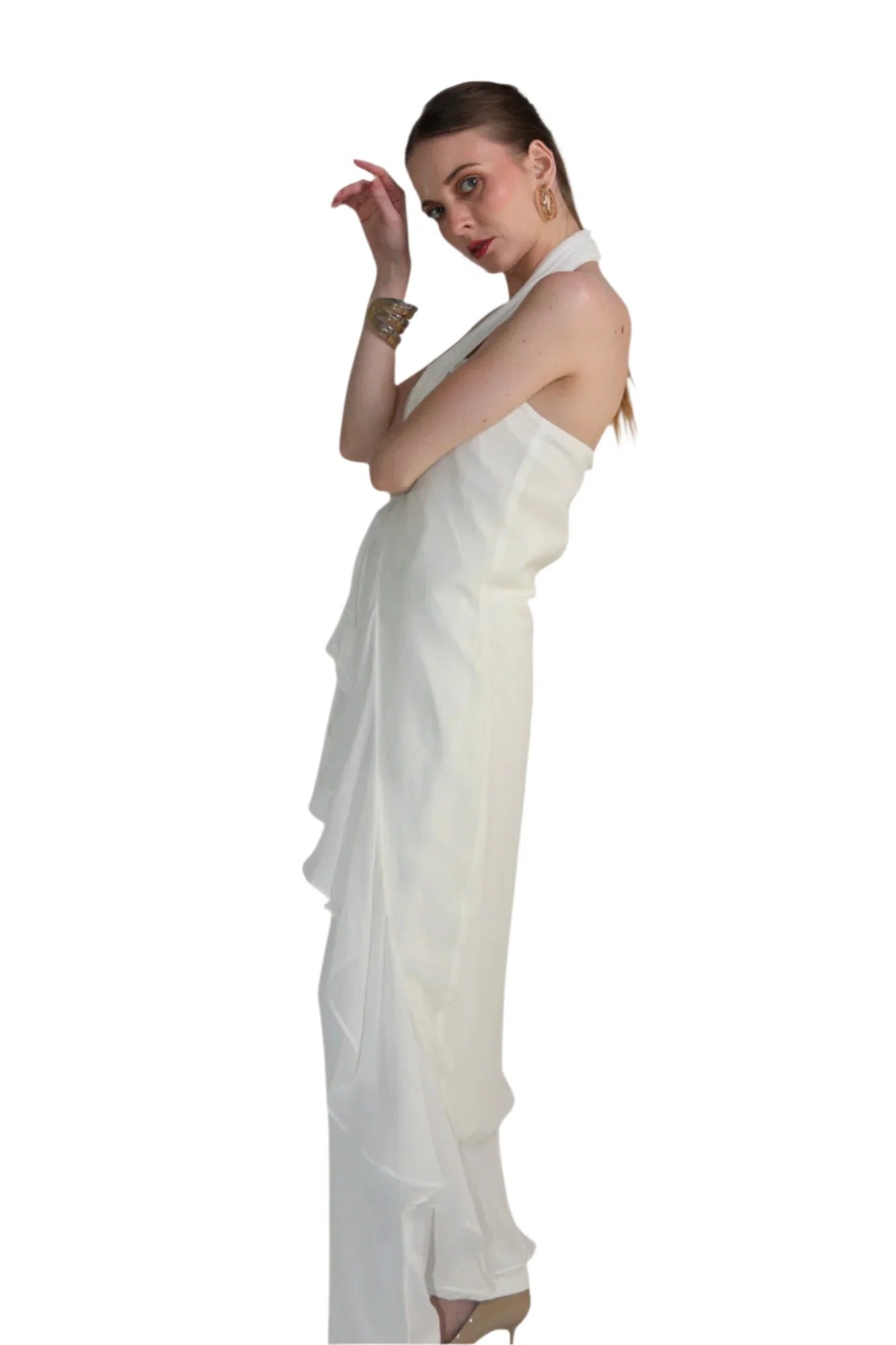 Breezy, graceful, and refined the Elegant Halter Drape Resort Co-ord Set captures the essence of relaxed sophistication. Crafted from lightweight georgette and crepe, this ensemble flows beautifully with every movement. The halter draped top with a lined bodice pairs perfectly with tailored pants, making it the ideal choice for resort dinners, tropical escapes, or elegant summer gatherings.