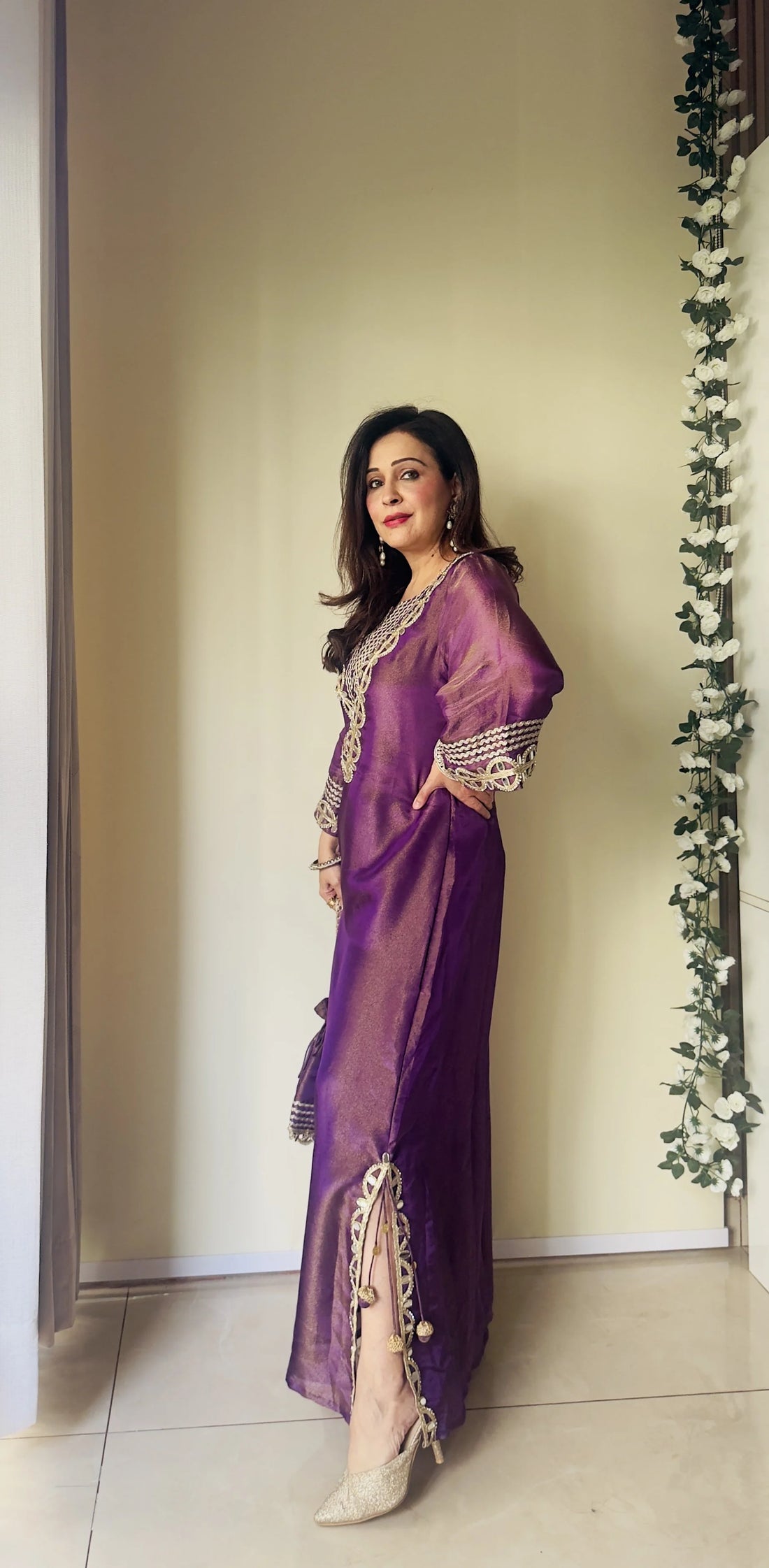 The Elegant Purple Prism Tissue Dress is crafted to combine festive charm with effortless comfort. Made from lightweight tissue fabric, it drapes beautifully while providing a soft, airy feel for all-day wear. The vibrant purple shade with subtle prism detailing adds a graceful sparkle, making it perfect for family gatherings, festive occasions, and special celebrations. Note: Potli bag is sold separately.