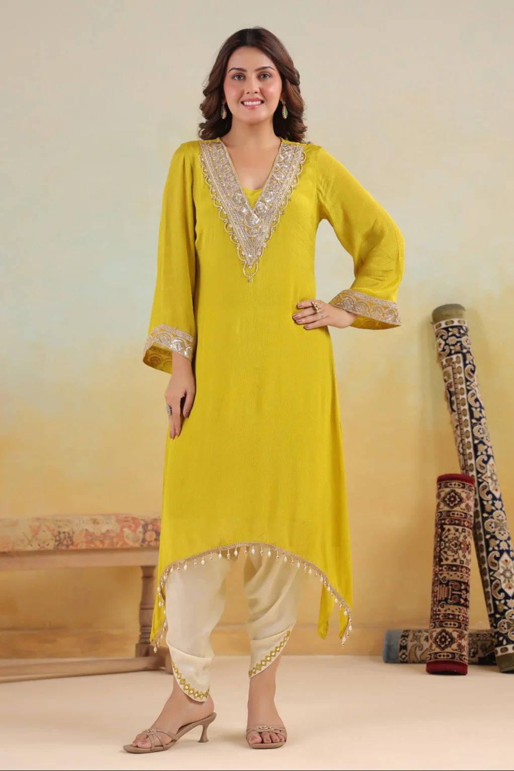 Redefine elegance with this embroidered Chinon kurta pant set a perfect balance of style, comfort, and handcrafted sophistication.
