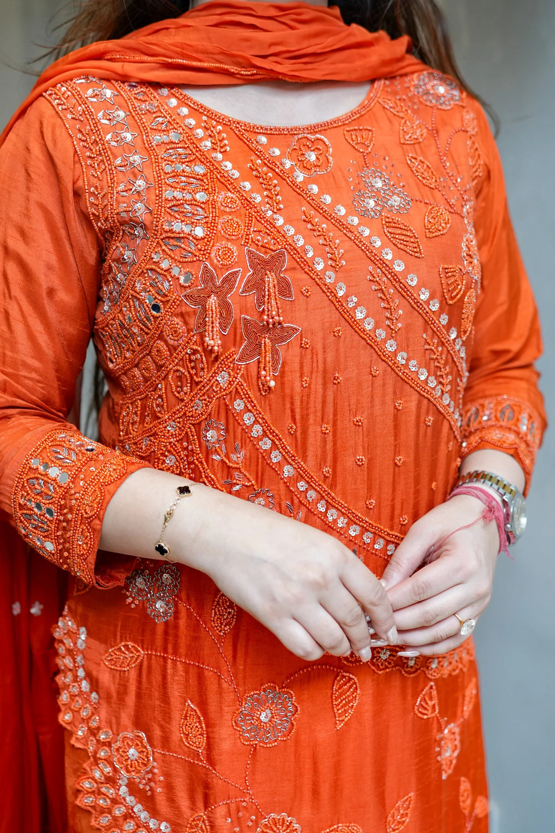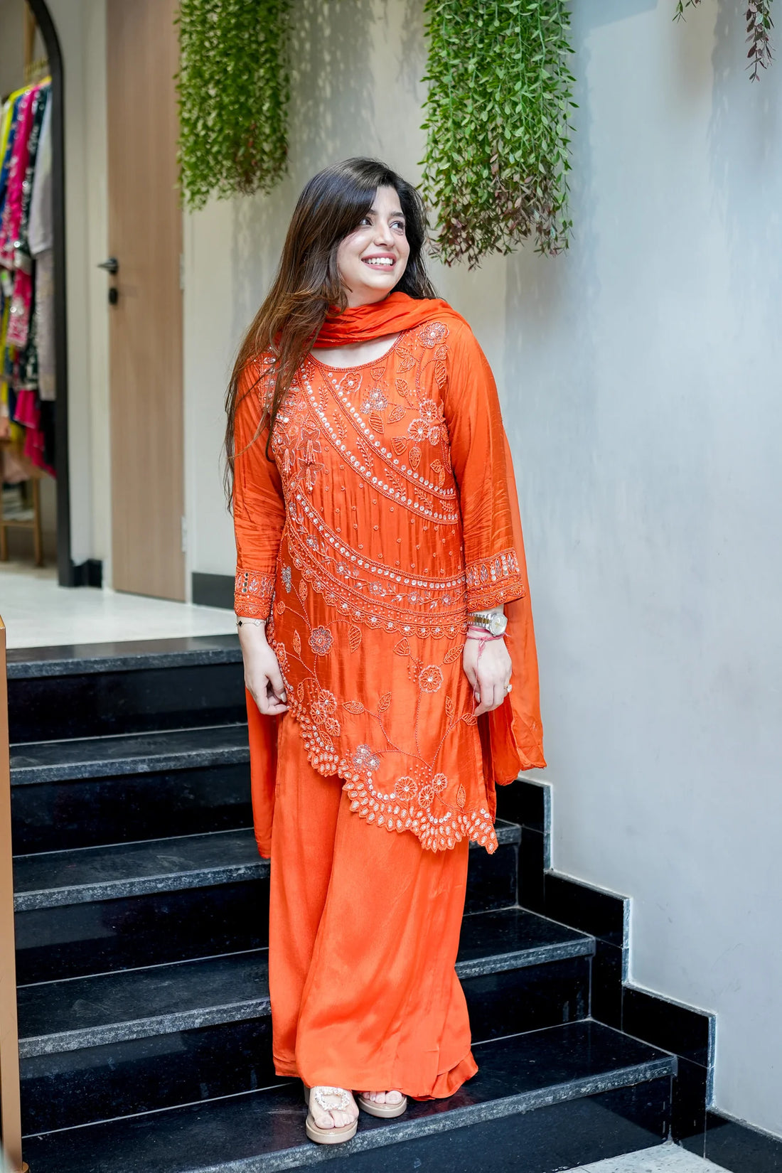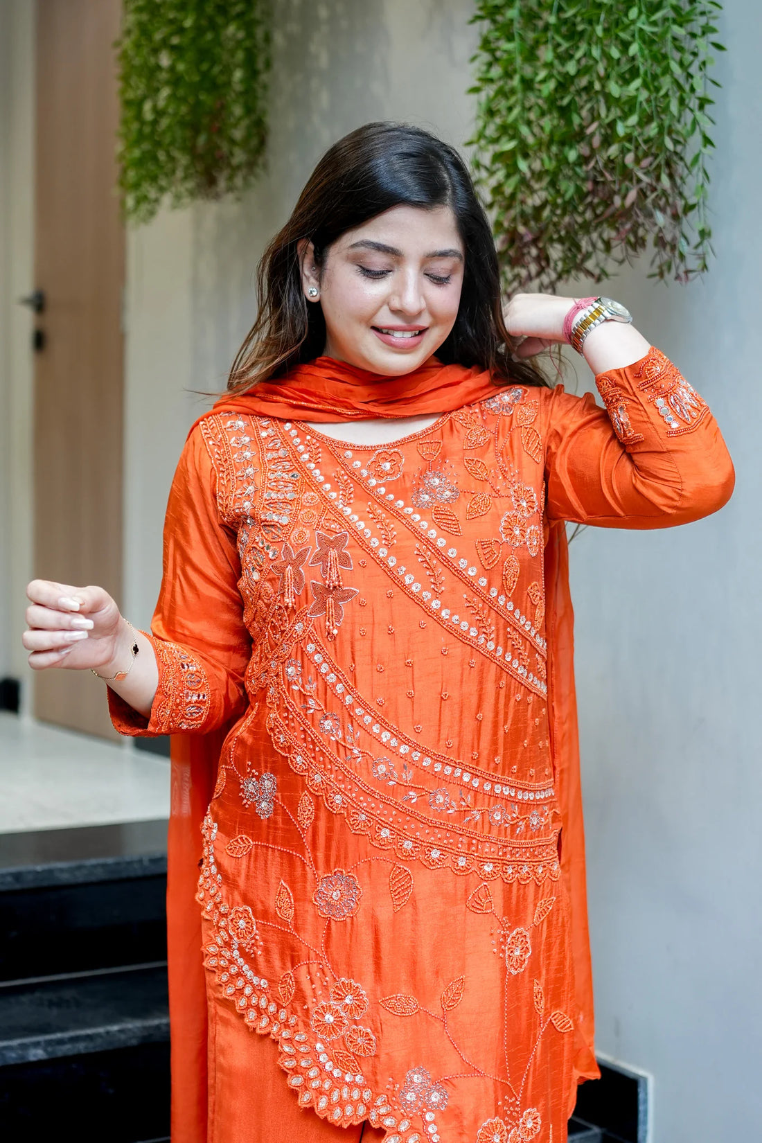 The Embroidered Upside Down Silk Suit Set is a perfect blend of contemporary design and traditional Indian elegance. Made from luxurious silk, this ensemble features unique upside-down embroidery patterns that add a modern artistic flair while keeping an ethnic touch. The set includes a tailored kurta, matching bottoms, and a complementing dupatta, creating a complete, graceful look. Its rich texture, intricate embroidery, and sophisticated design make it ideal for festive celebrations, family gatherings, and special occasions.