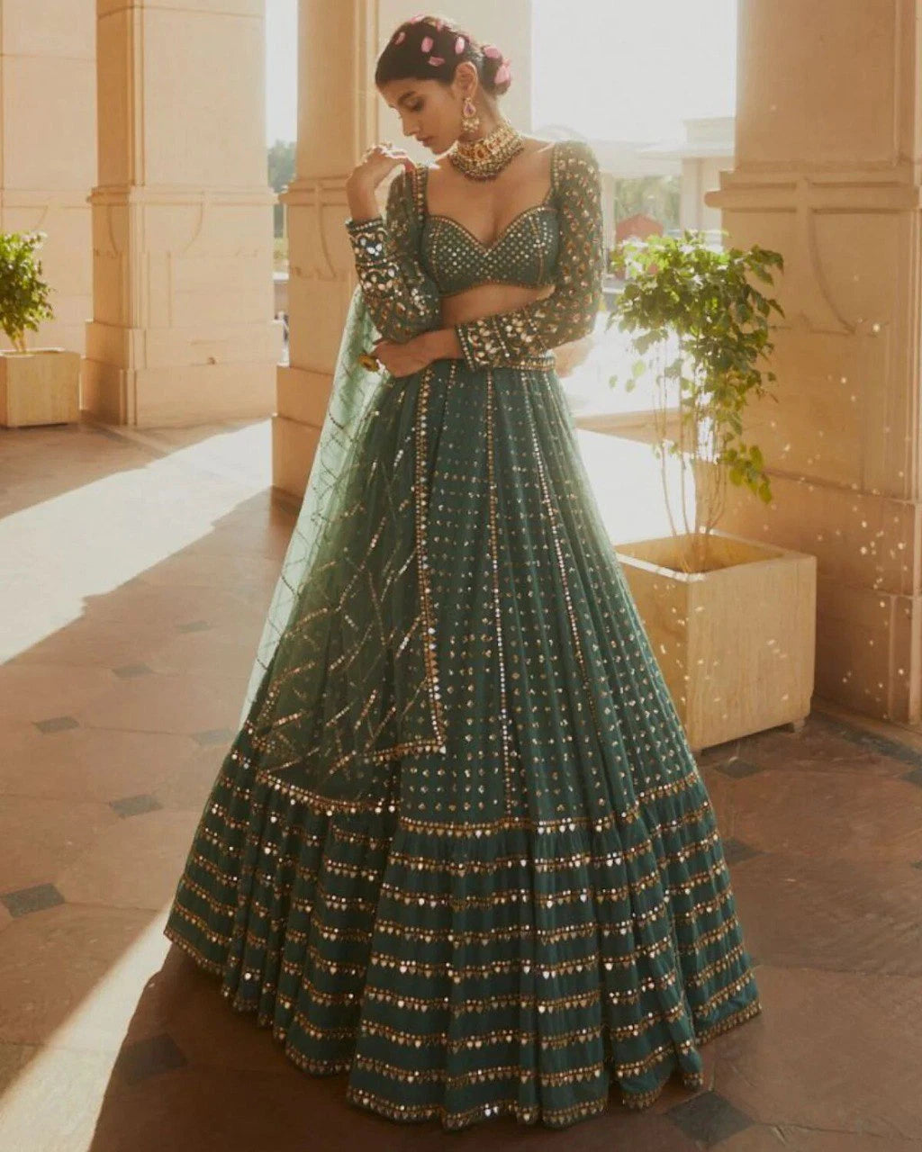 The Faux Georgette Sequined Lehenga Set exudes festive glamour and sparkling elegance. Crafted from lightweight faux georgette, the lehenga features intricate sequins and zari embroidery with a 4-meter flair for dramatic movement. Paired with an unstitched blouse piece and a 2.25-meter net dupatta with soft micro fabric lining, this ensemble is perfect for weddings, sangeets, or special celebrations.