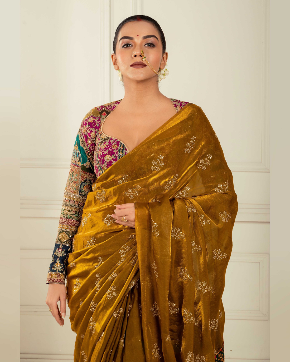The Golden Glory Bronze Gold Saree with Embroidered Blouse is an epitome of regal sophistication and festive allure. Expertly crafted with a luxurious blend of butter metallic tissue and soft georgette, this half-and-half saree radiates a golden glow that captures every eye. Adorned with intricate multi-colored sequins and fine thread embroidery, it offers a perfect balance of shimmer and elegance.