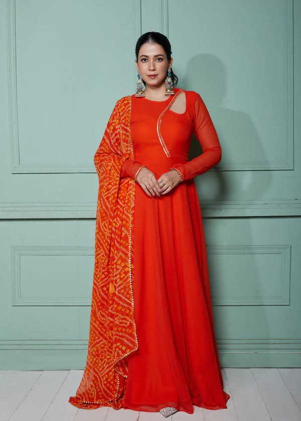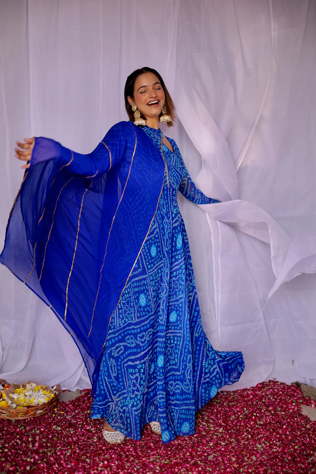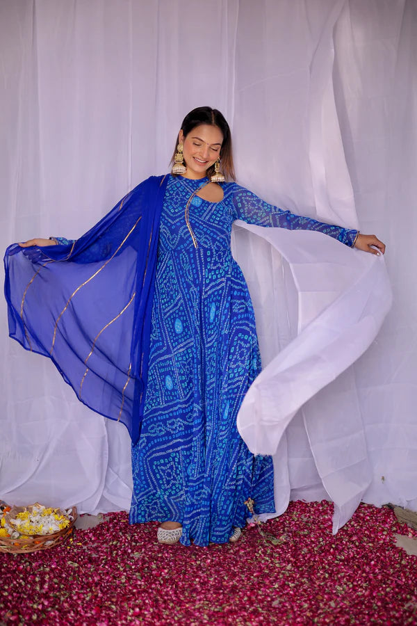 Celebrate every special moment with the Graceful Navy Blue Bandhani Anarkali Outfit – a radiant ensemble that captures tradition, elegance, and contemporary charm.