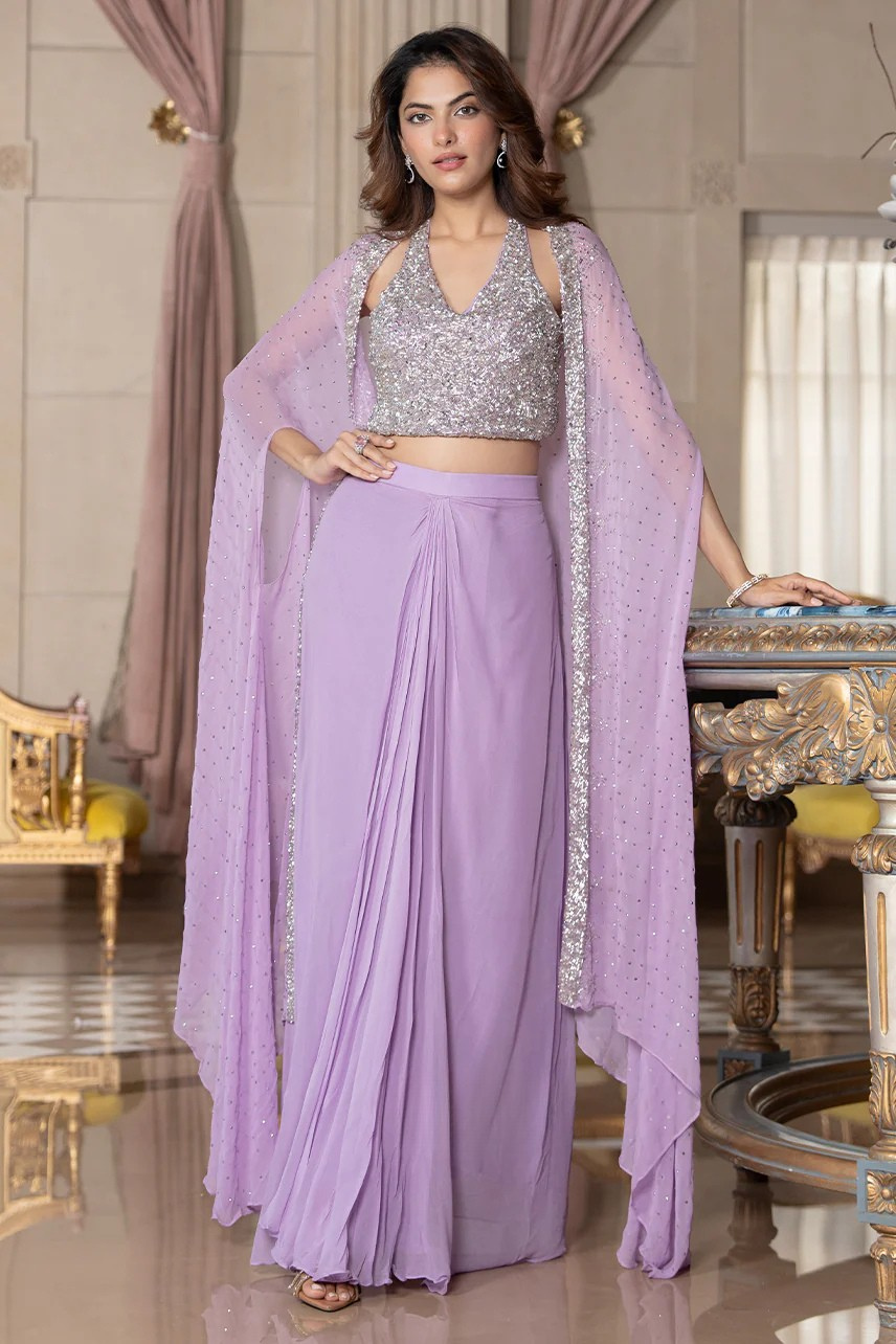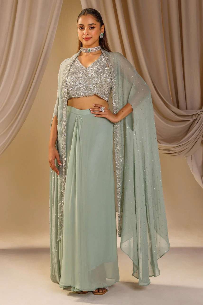 Make every moment memorable with the Green Mint Majesty Georgette Cape Set — your go-to ensemble for modern elegance and timeless style.