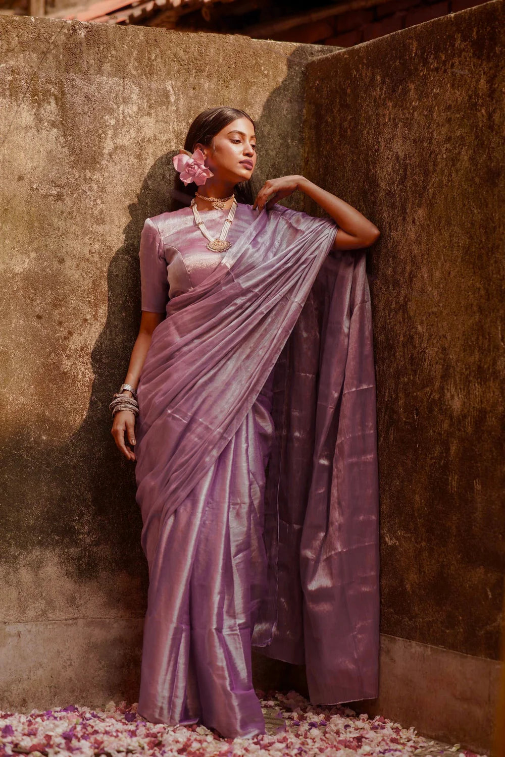 Step into serene elegance with this handwoven lavender tissue saree and matching blouse combo. The soft lavender hue exudes calm sophistication, while the delicate shimmer and fluid drape create a graceful silhouette. Paired with a matching tissue blouse featuring a scoop neckline and exquisite glass sleeves, this ensemble blends traditional charm with contemporary refinement. Perfect for evening events, festive celebrations, or special occasions, it ensures you radiate timeless beauty and elegance.