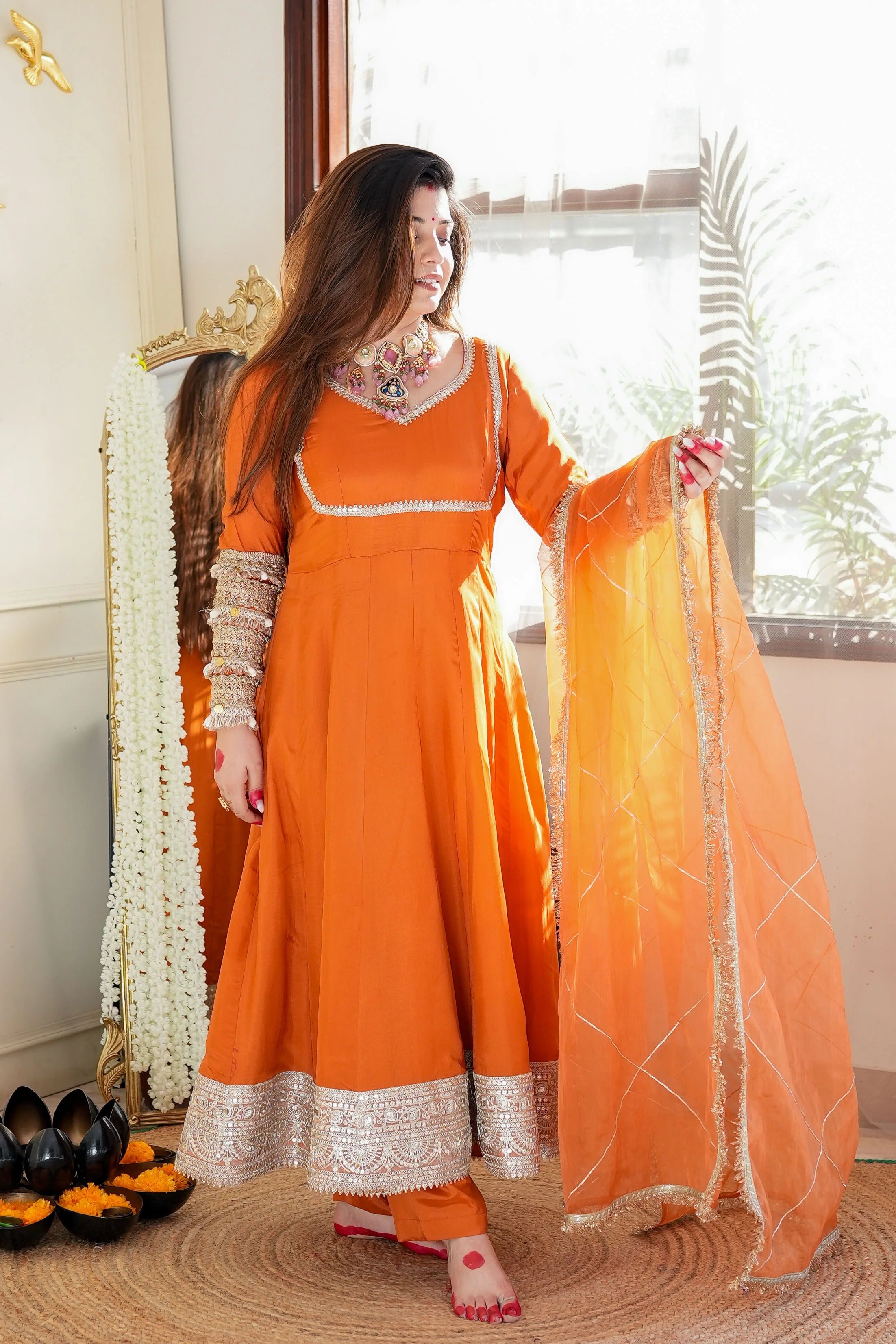 The Hayaat Rust Anarkali Set is a stunning ensemble that combines traditional elegance with contemporary style. Crafted from premium Uppada silk for the suit and georgette for flowing comfort, this Anarkali set offers a luxurious drape and graceful silhouette. Featuring full sleeves and a flattering fit, it is perfect for weddings, festive events, or cultural celebrations. The rich rust hue adds vibrancy and sophistication, making this outfit a timeless wardrobe essential.