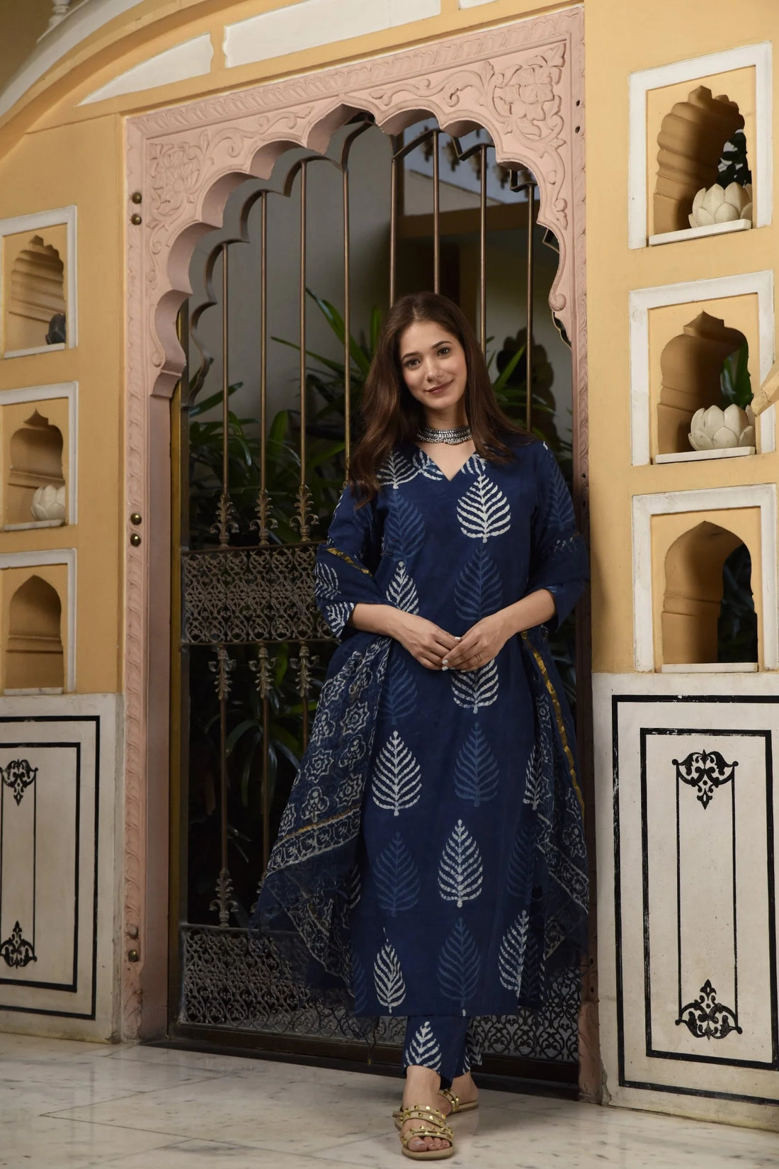 The breathable cotton kurta is paired with a lightweight kota doria dupatta that adds grace without heaviness, while straight-cut pants with pockets keep the outfit practical for daily wear. The deep indigo palette makes it effortlessly sophisticated and seasonless.