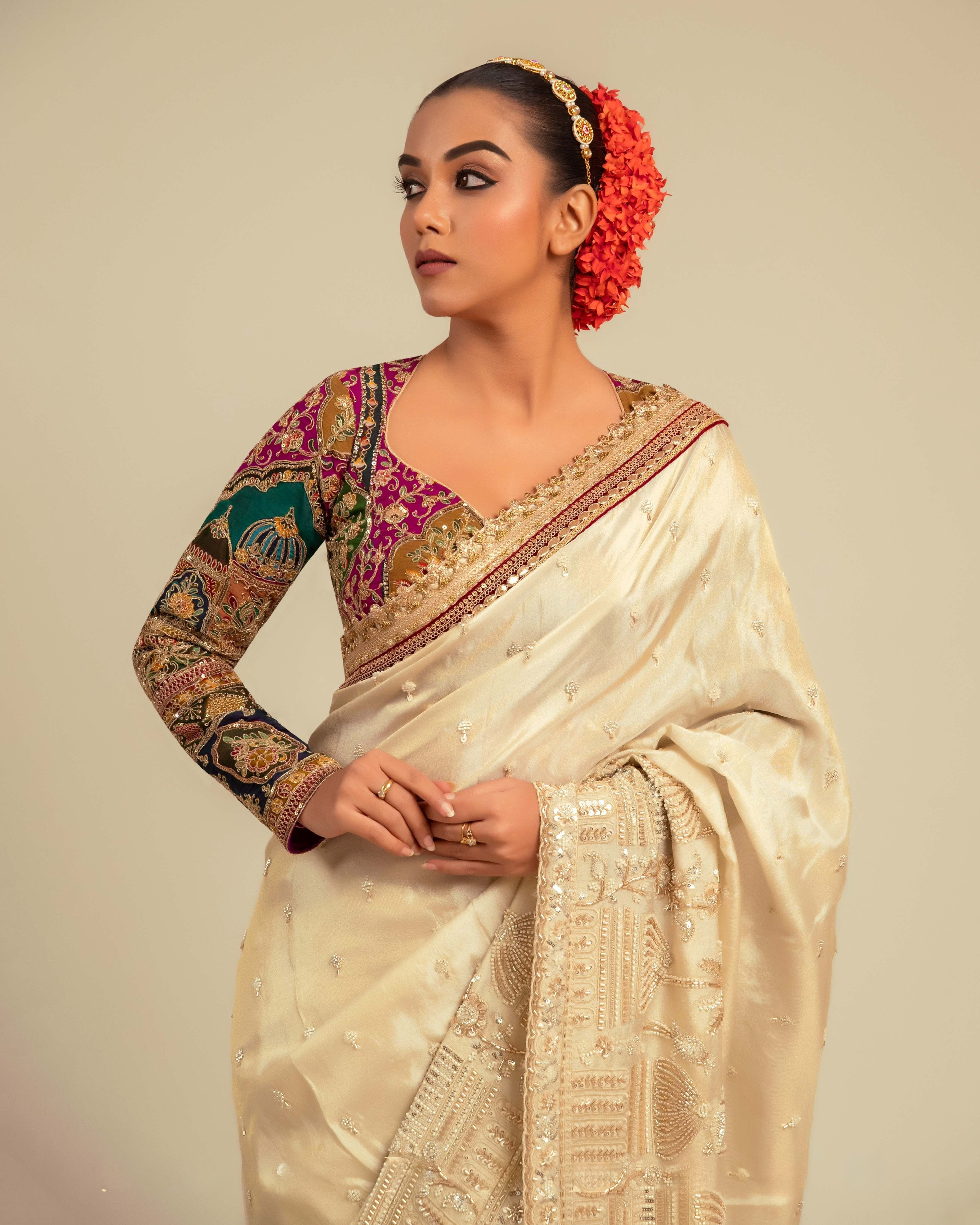 The Ivory White Viscose Tissu Saree paired with the Couture Charm Blouse brings timeless elegance to festive occasions. Crafted from soft viscose tissu, the saree drapes effortlessly, while the organza blouse features vibrant multicolor detailing that adds a playful yet sophisticated charm. Perfect for weddings, parties, or special celebrations, this ensemble combines flowing comfort with luxurious style, creating a graceful and striking look.