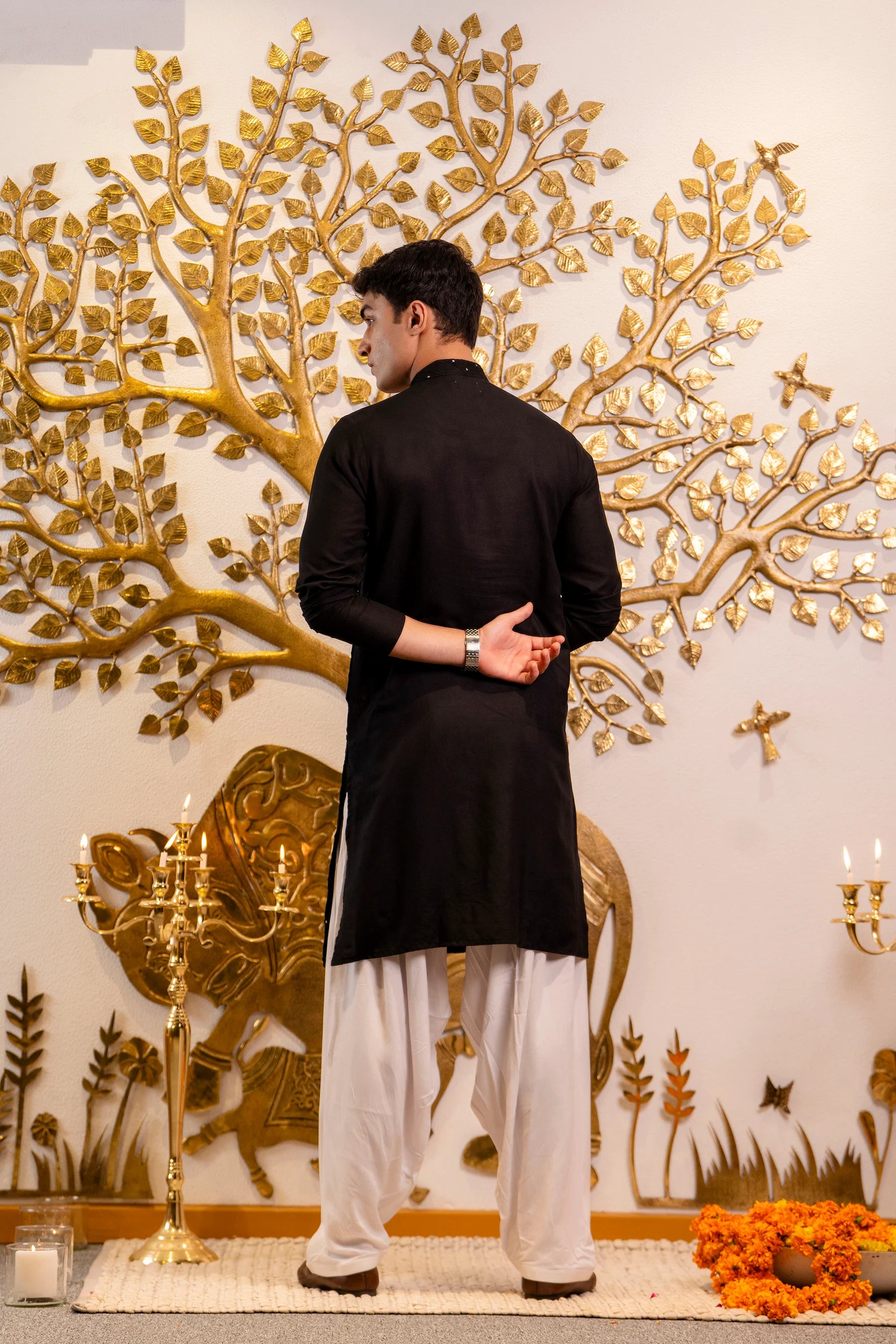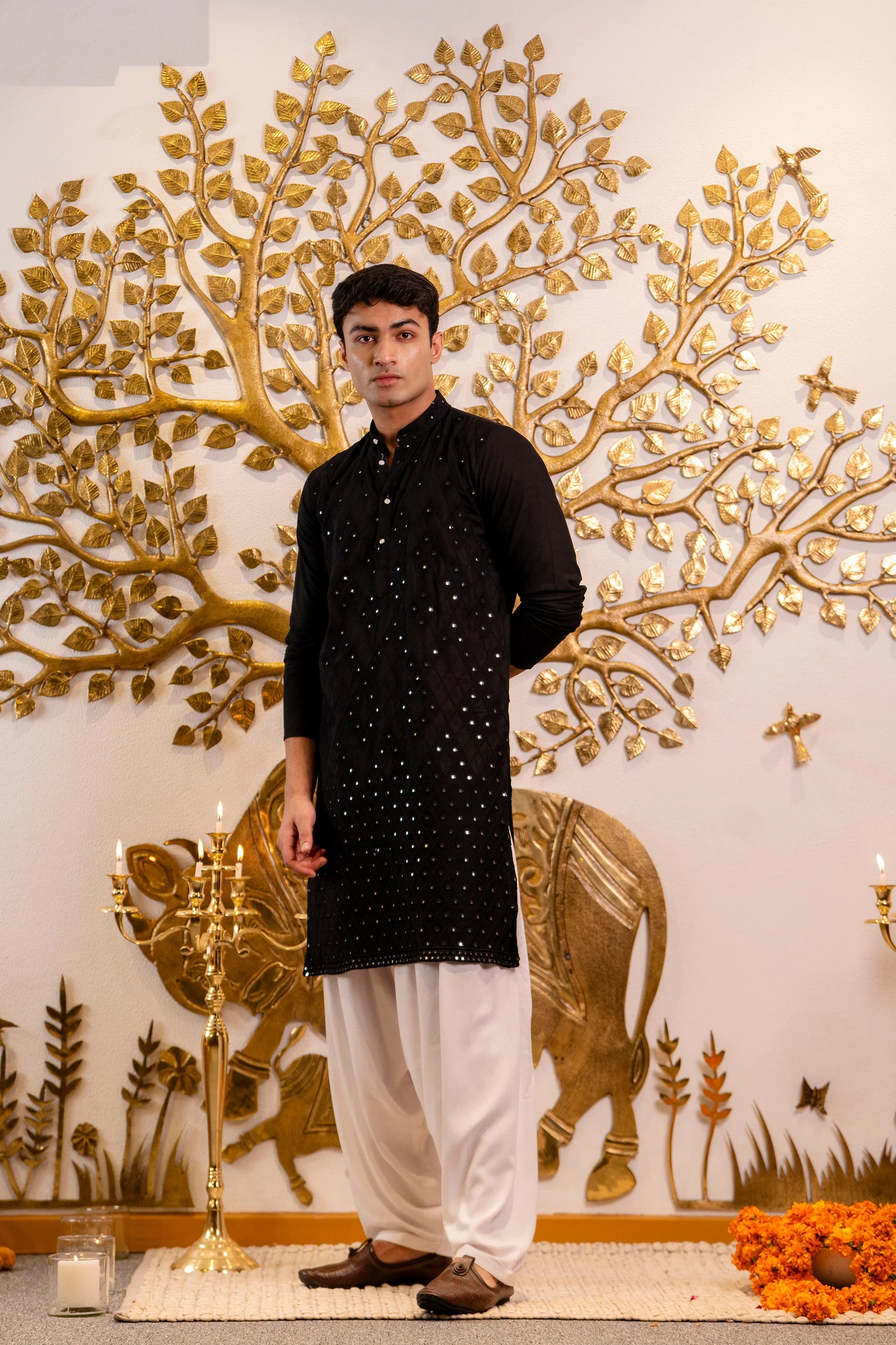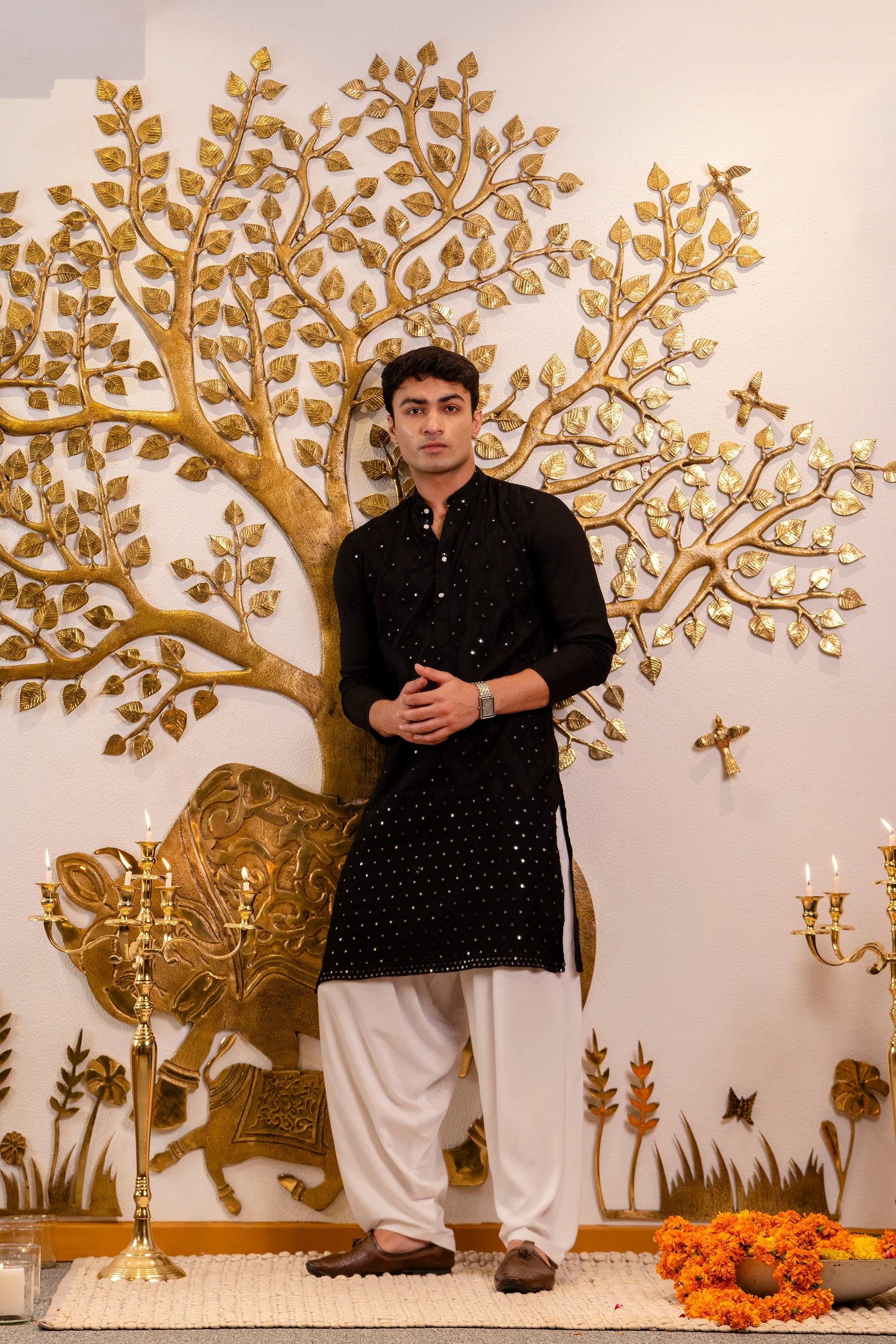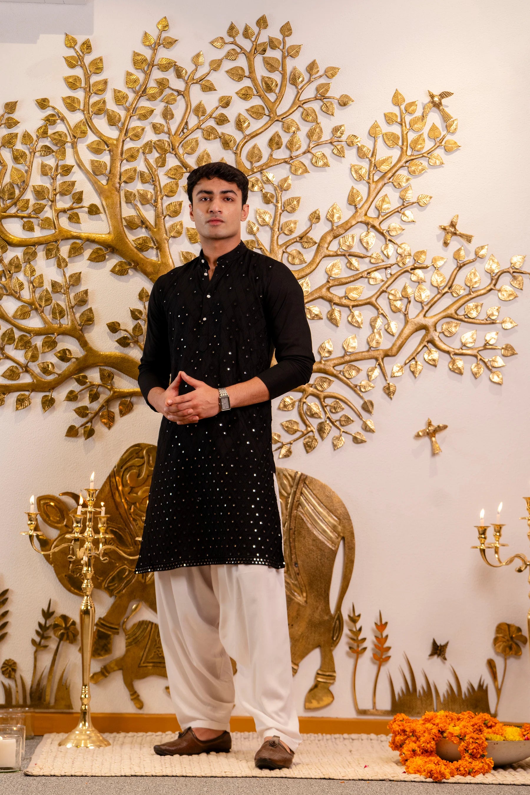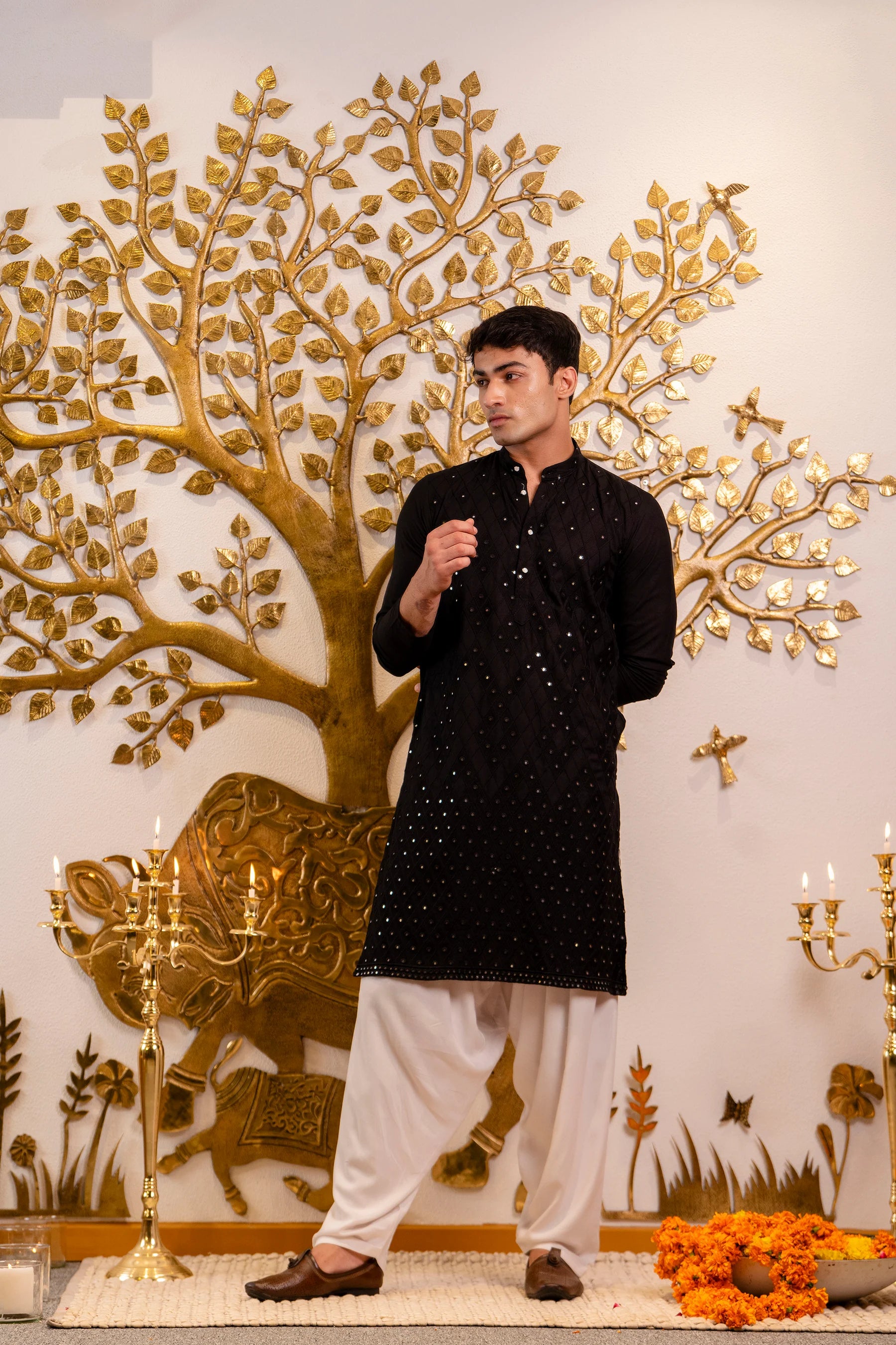 Add the Jet Black Cotton Chikan Mirror Kurta to your collection for a blend of tradition, elegance, and contemporary festive style.