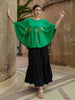 The poncho-style top has a relaxed round neckline, ideal for casual wear. Paired with a crinkled, tiered skirt, it creates a fluid silhouette that flatters all body types. Delicate hand-sequined details add a touch of boho sparkle.