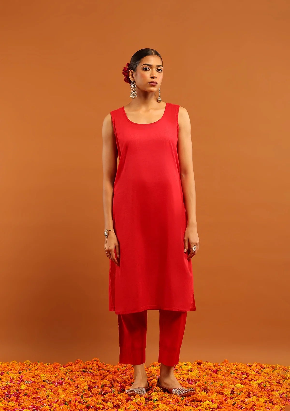 The Karisma Red Chanderi Chikankari 4PC Kurta Set exudes elegance and festive sophistication. Crafted from rich Chanderi fabric, the straight-fit kurta is adorned with delicate Chikankari embroidery, featuring a round neckline and 3/4th sleeves for a graceful silhouette. Paired with coordinated bottoms and a dupatta, this set is perfect for weddings, festive gatherings, and special celebrations, combining traditional artistry with modern comfort.