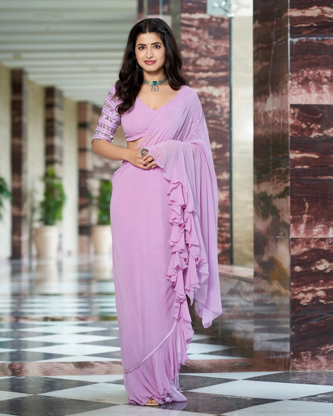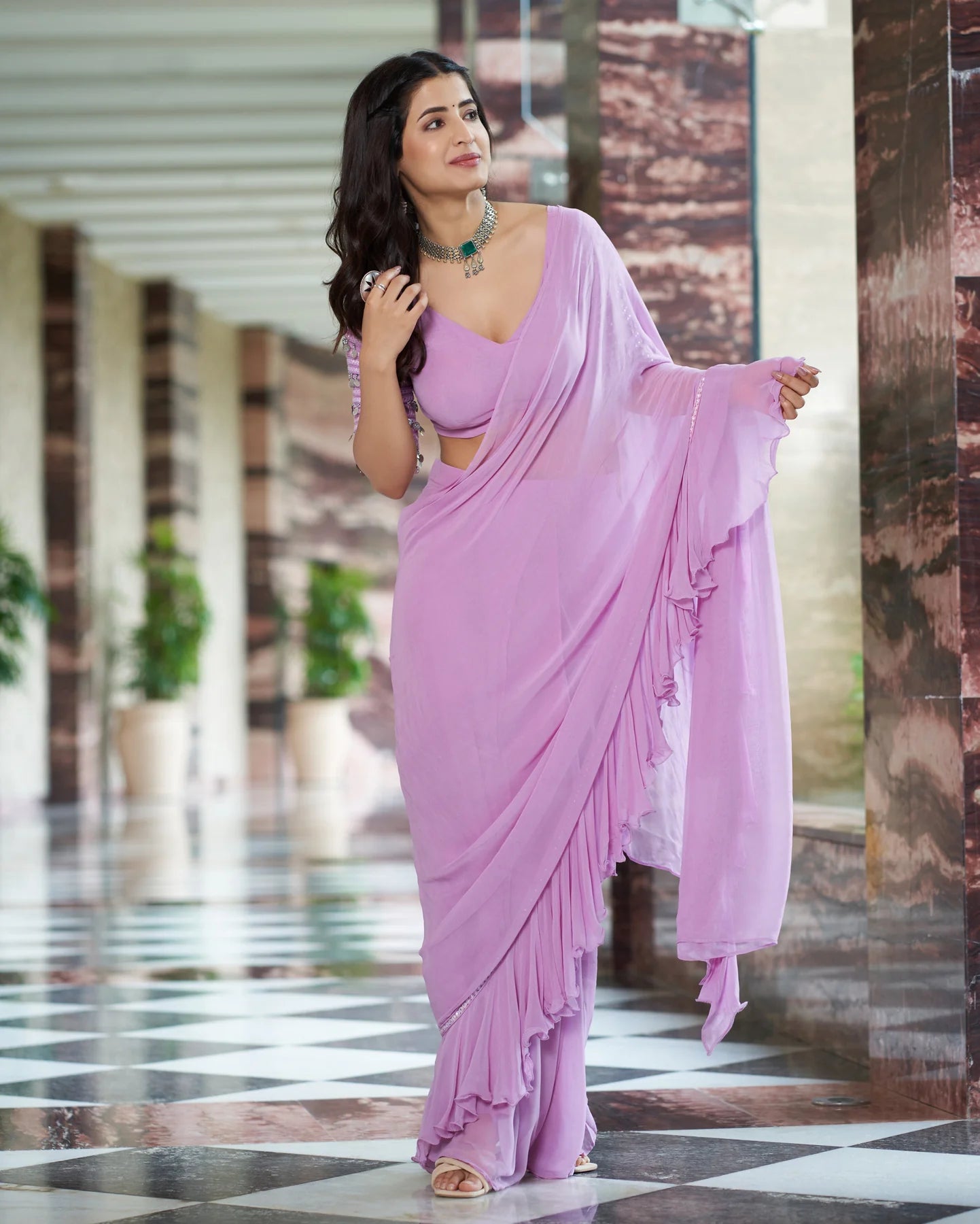 Add this Lavender Georgette Solid Pre-Draped Saree to your collection for a modern, elegant ensemble that combines comfort, style, and effortless sophistication.