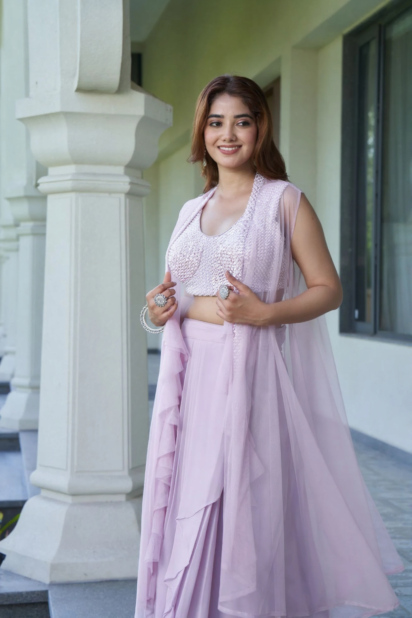 Step into effortless sophistication with the Light Pink Viscose Skirt Jacket Set, designed to blend comfort and charm. Crafted from soft viscose fabric with delicate handwork, intricate piping, and subtle sequin accents, it offers a perfect touch of understated glamour. The coordinated skirt and inner top are paired with a breezy net jacket, creating a layered look that feels both light and luxurious. The soft pink hue adds a graceful and feminine tone, ideal for festive gatherings, family functions, and elegant daytime events.