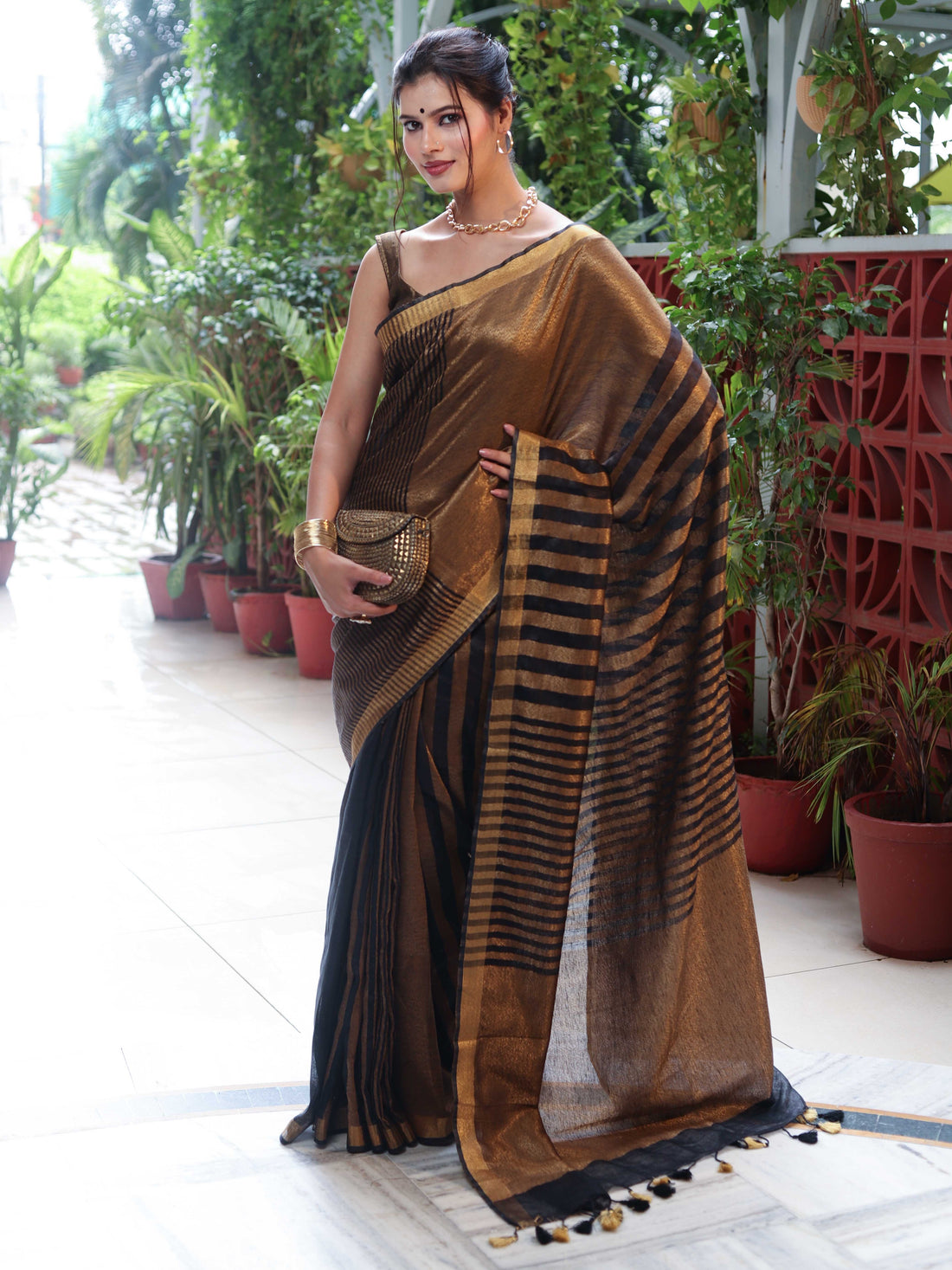 Step into luxury with the Linen Tissue Gold & Black Metallic Shine Saree with Stripes. Crafted from premium linen tissue fabric, this saree boasts a soft metallic shine that radiates sophistication. The gold and black combination, enhanced with delicate stripes, adds a bold yet graceful touch—making it perfect for festive occasions, weddings, and evening gatherings. With its timeless charm, this saree is designed to make you stand out effortlessly.